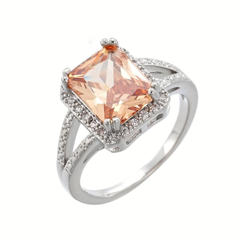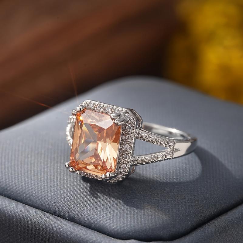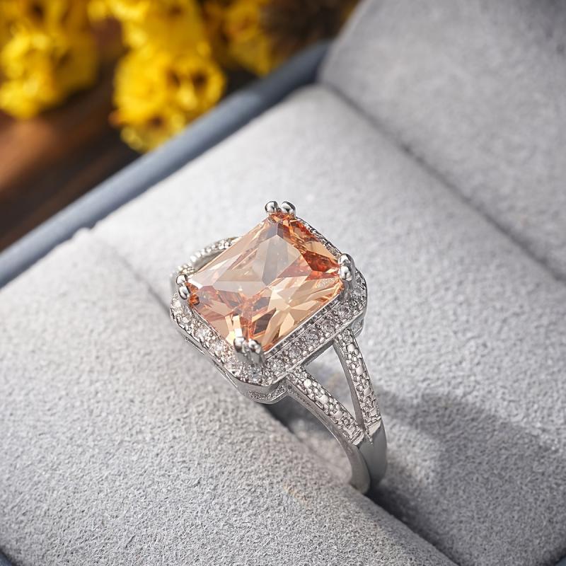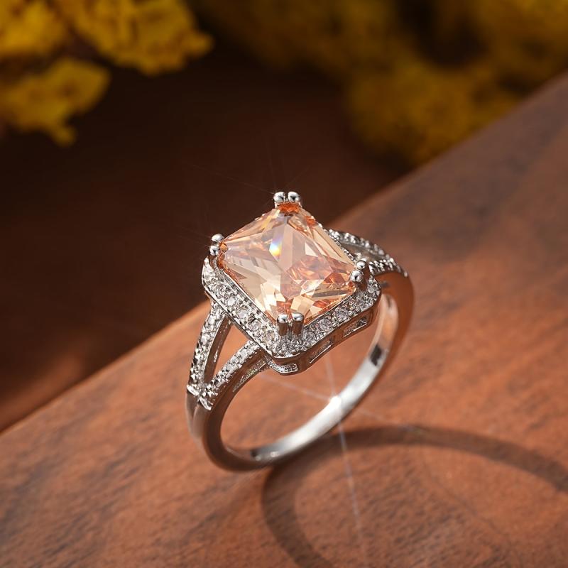 This elegant and unique ring set features a square bezel engagement ring with a champagne wedding band. It makes a perfect anniversary gift or a beautiful accessory for any special occasion.