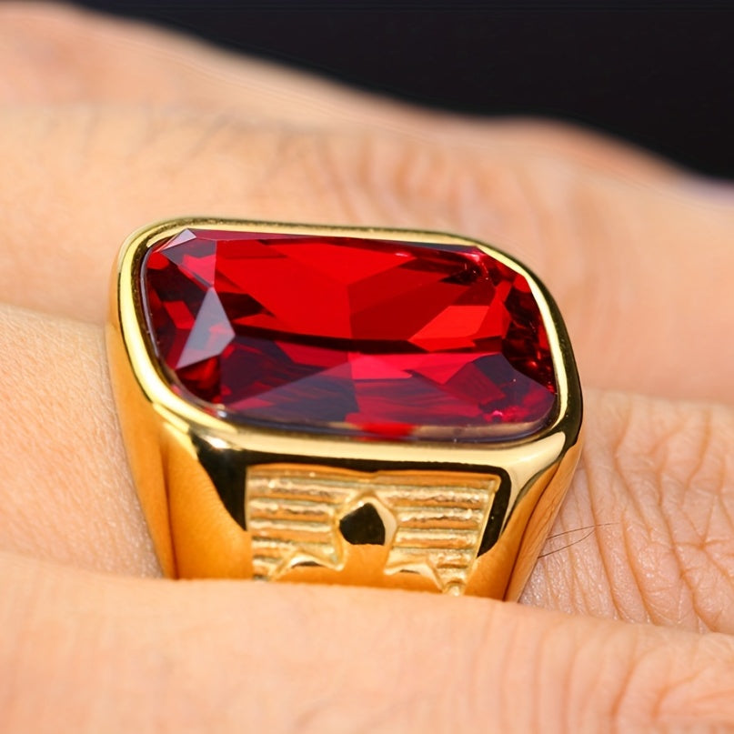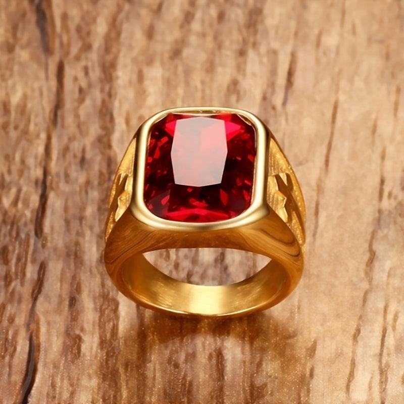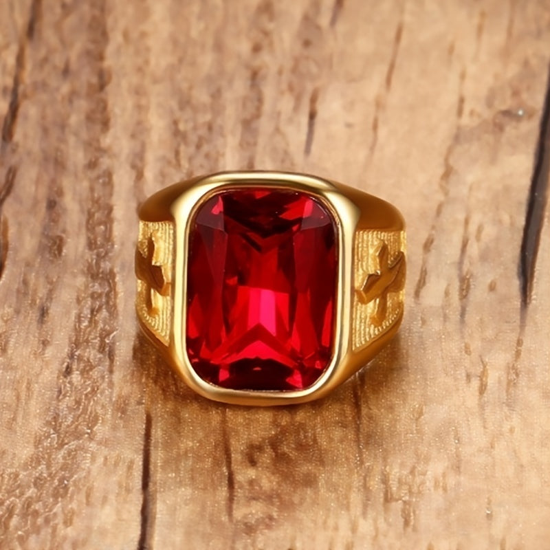 Enhance your style with this stunning square red stone cross ring designed for men. Perfect accessory for any occasion.