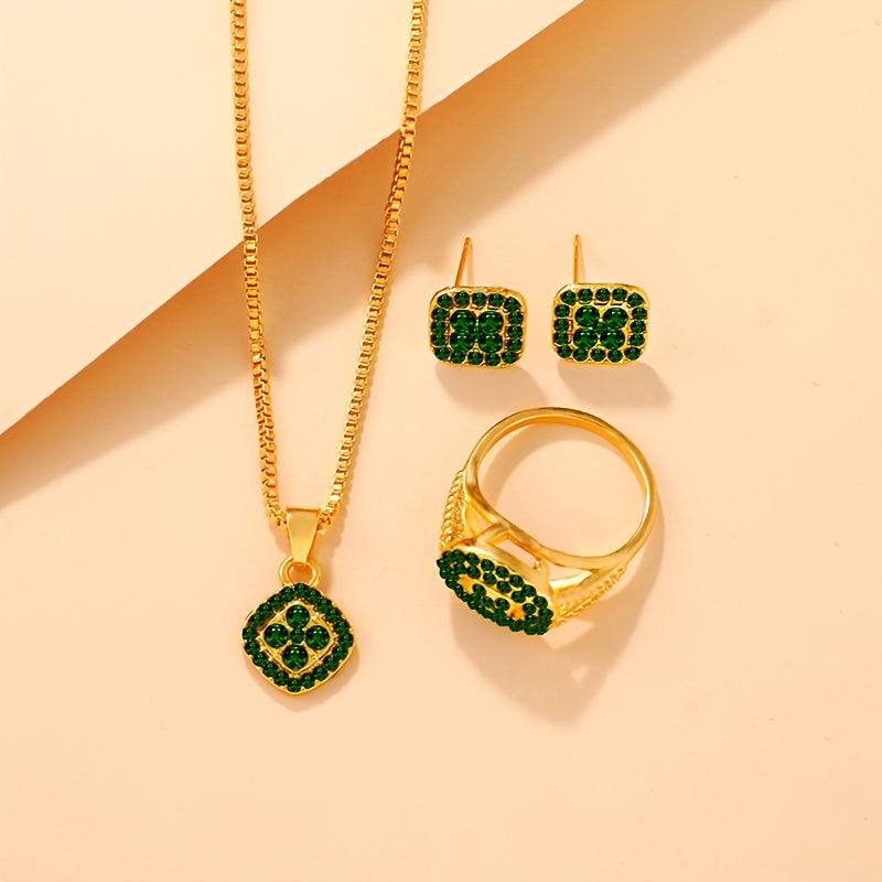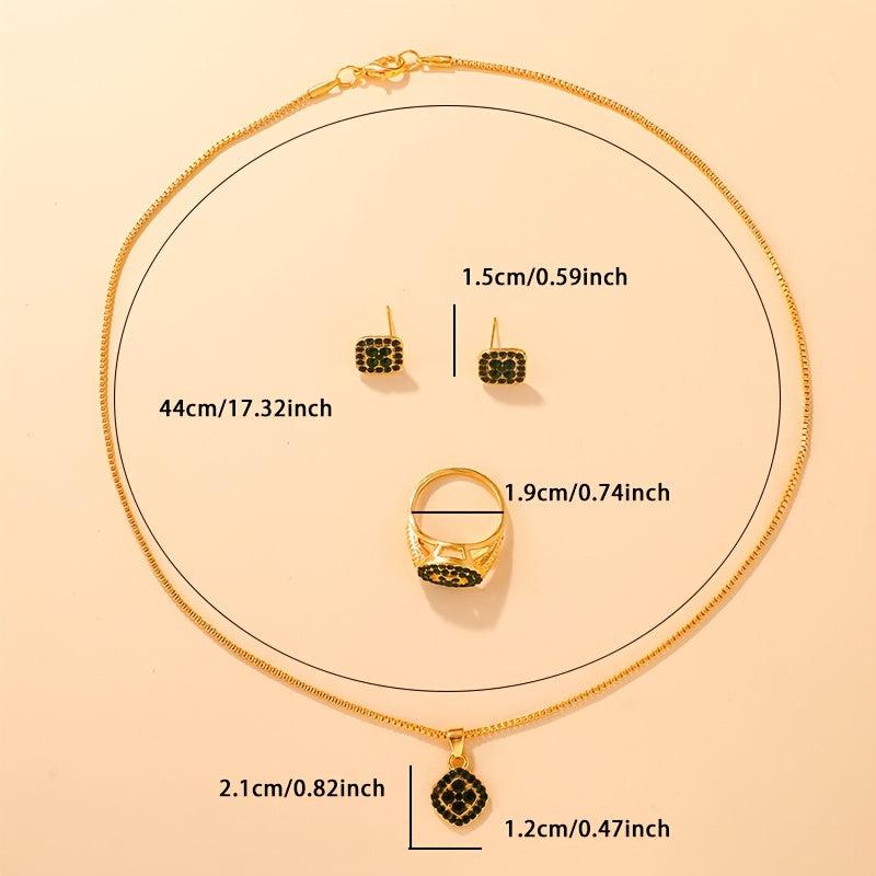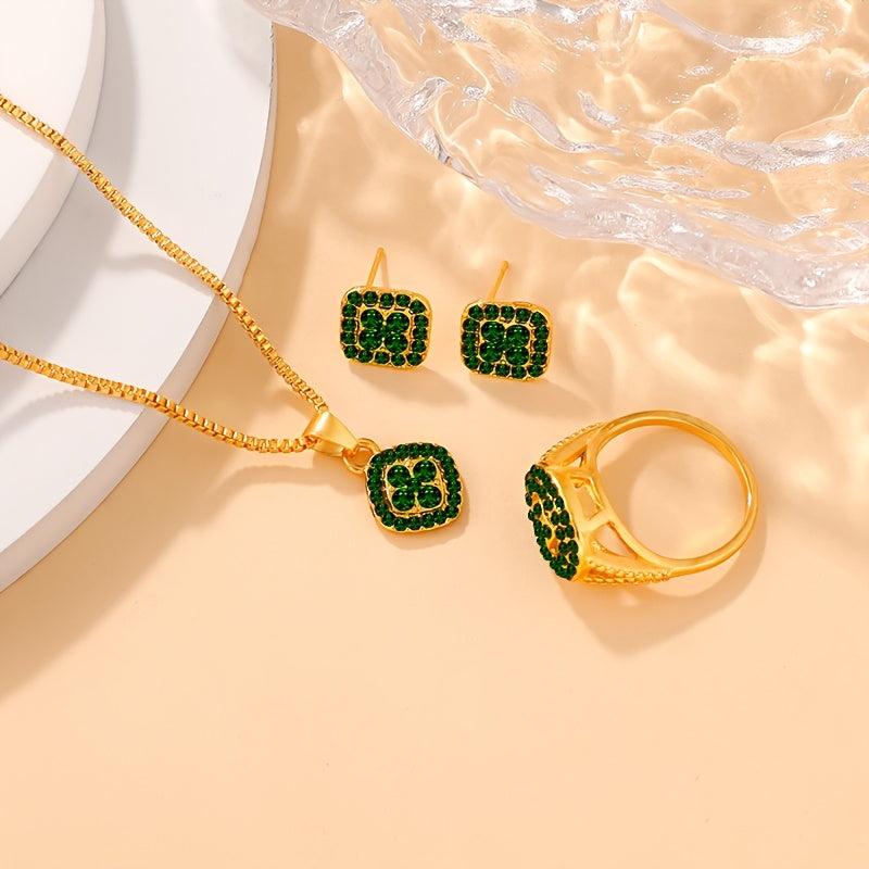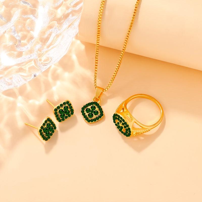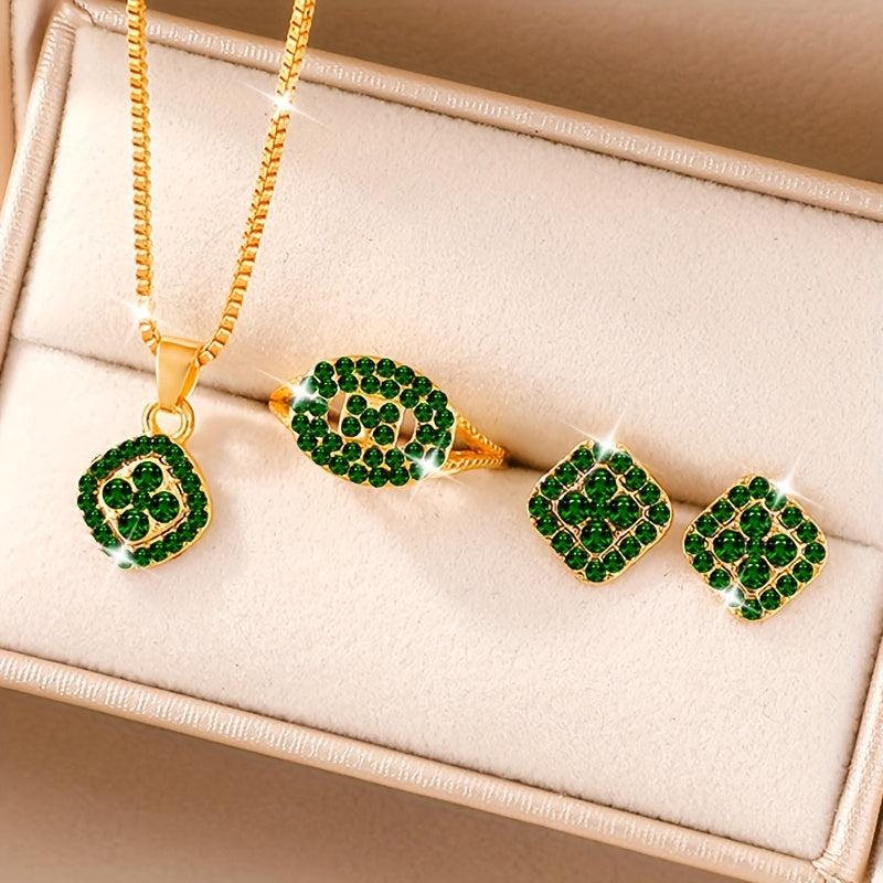 Complete jewelry set featuring a square shaped design, includes a necklace, earrings, and ring. A perfect gift for your mom, wife, or daughter.