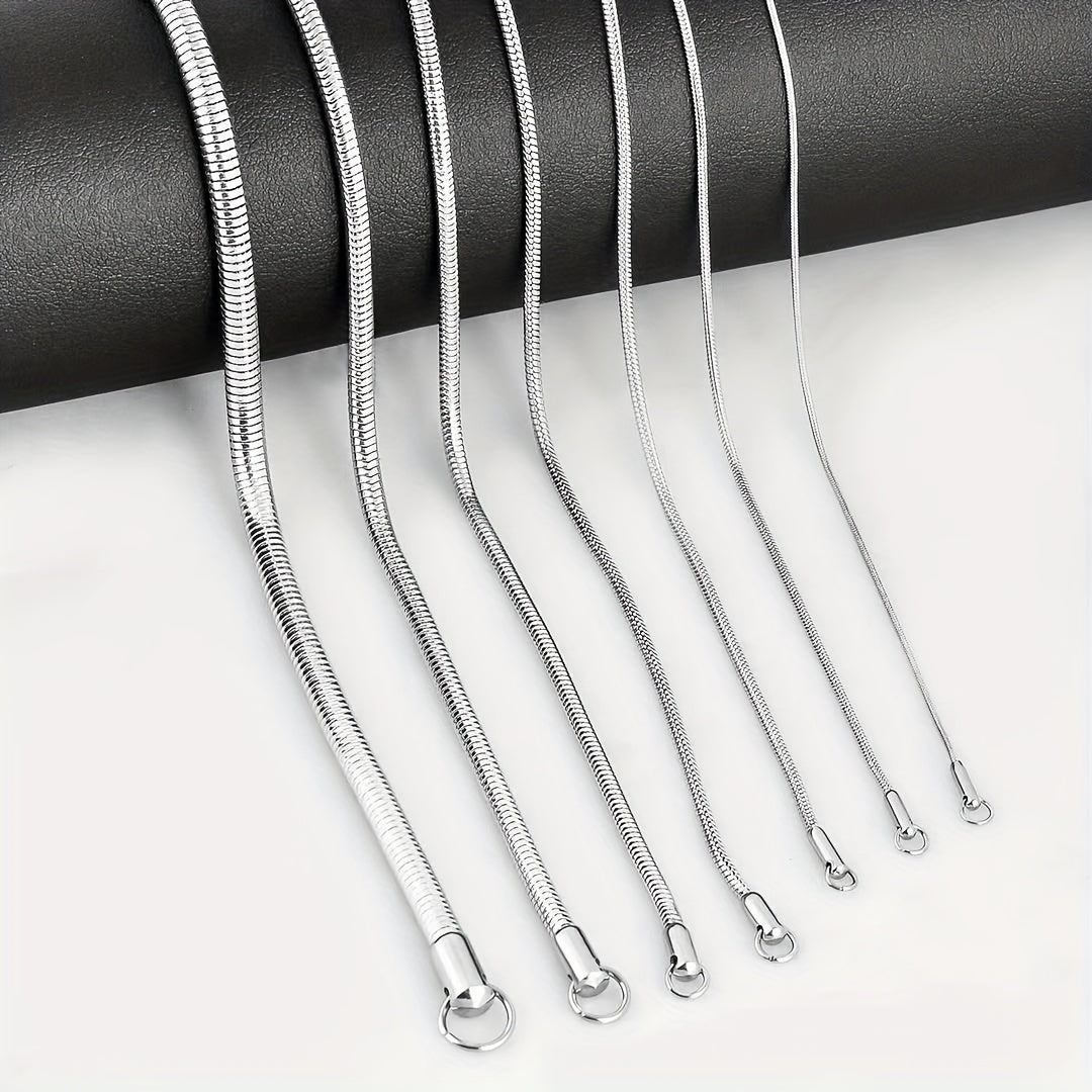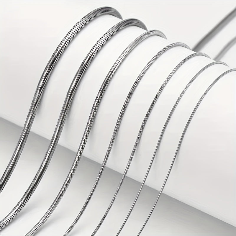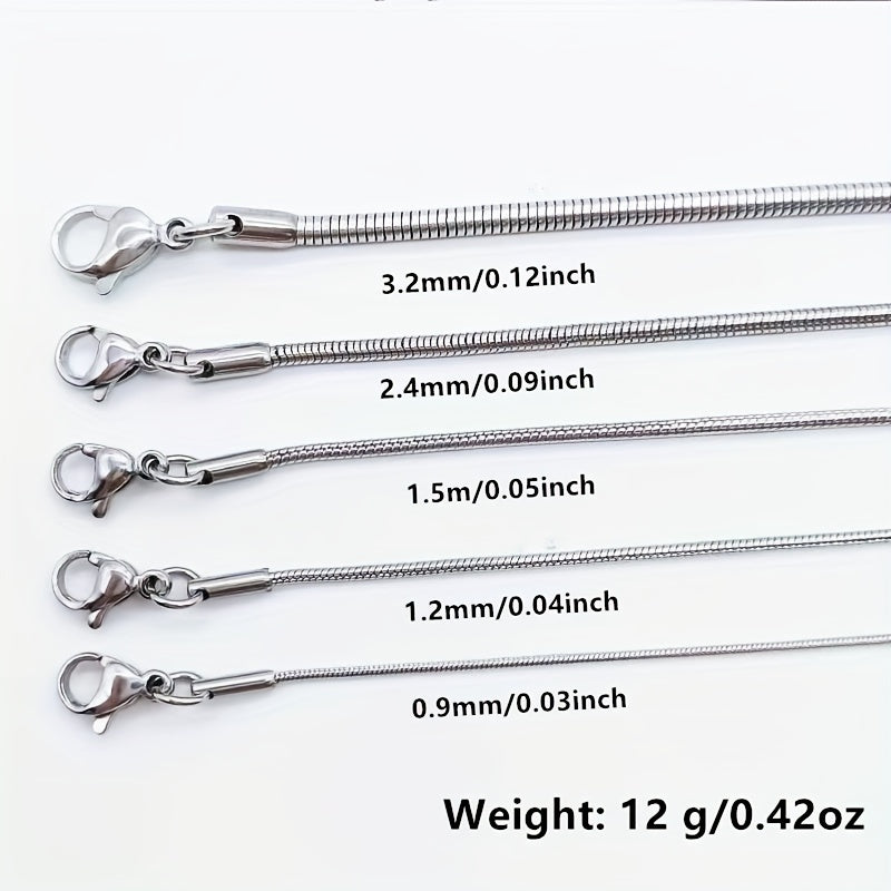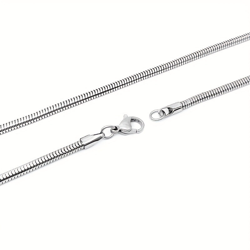 This stainless steel necklace features a 1.5mm round snake bone chain design, suitable for both men and women. It is perfect for everyday wear or as a stylish accessory.