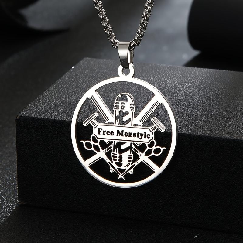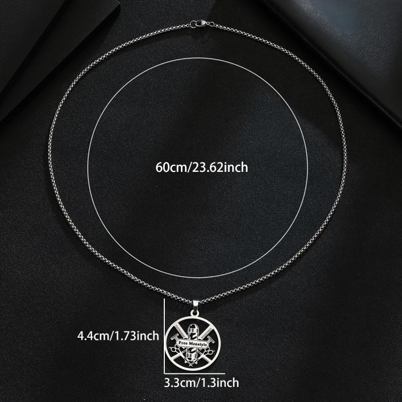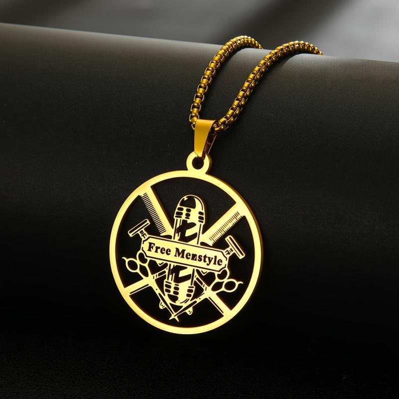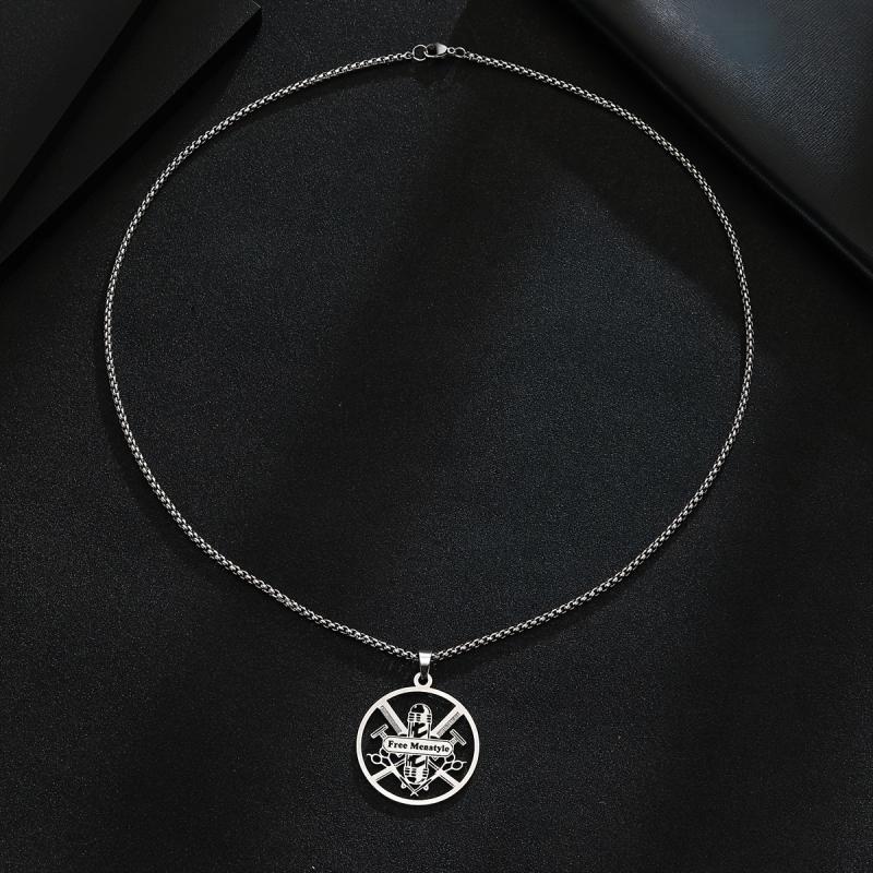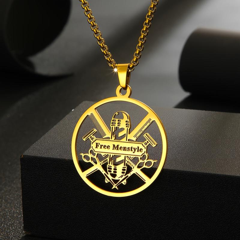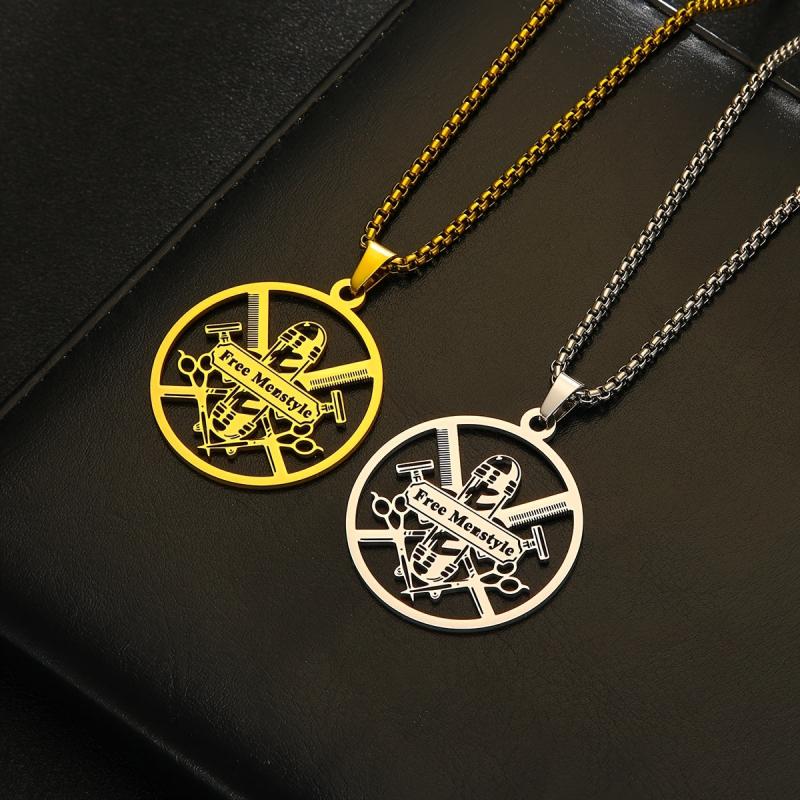 This durable men's necklace features a barber tools pendant and can be personalized with a name. Ideal for gifting or personal use, this stainless steel jewelry is stylish and unique.