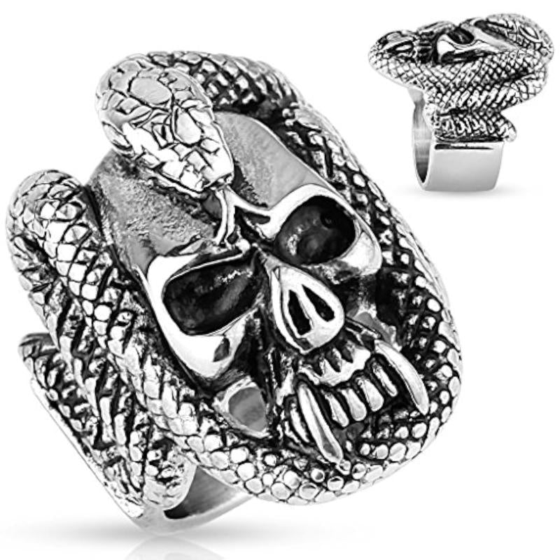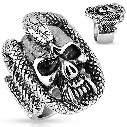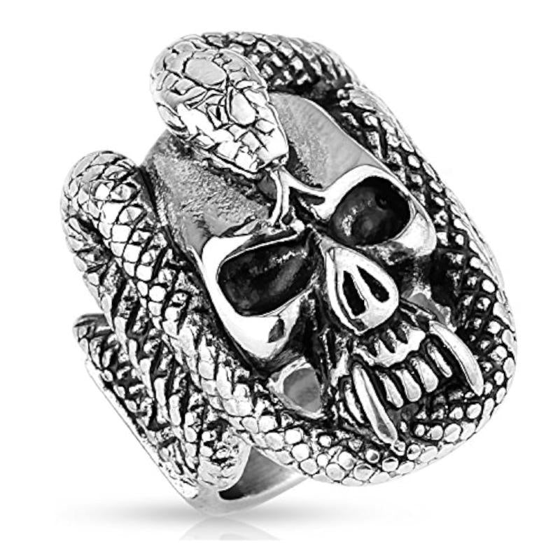 This stainless steel ring features a skull design that is perfect for bikers and roadies.