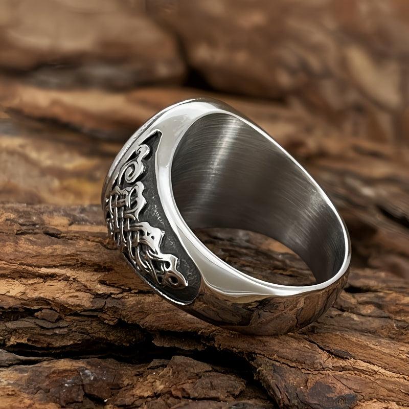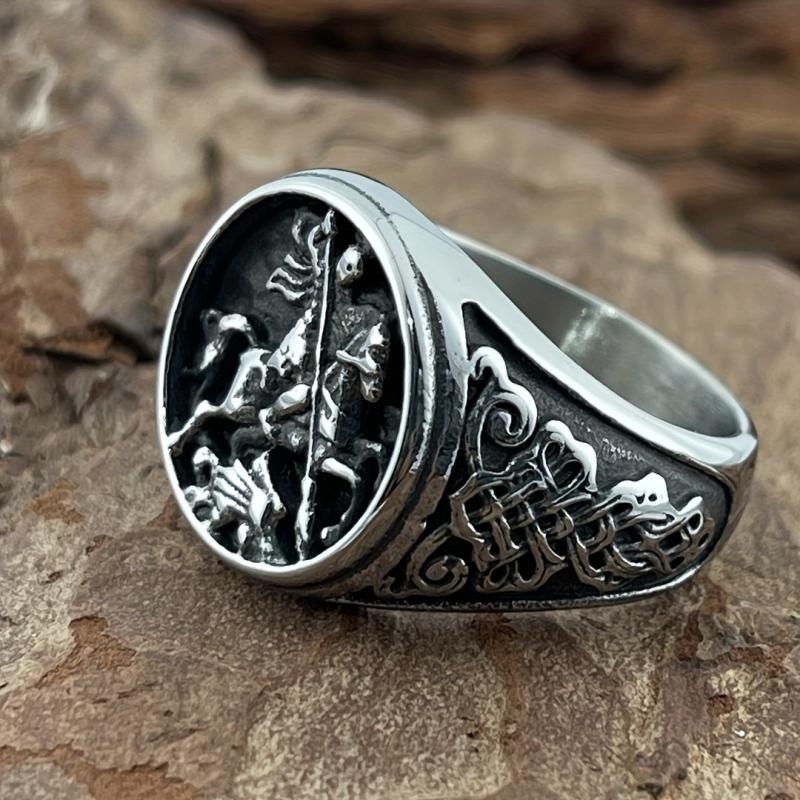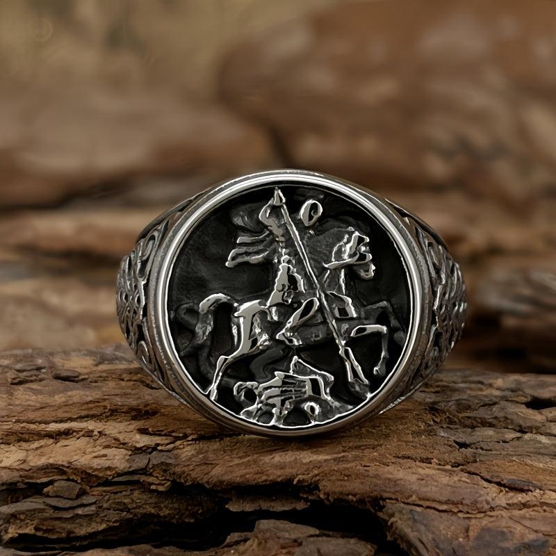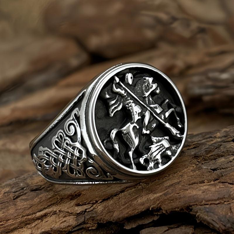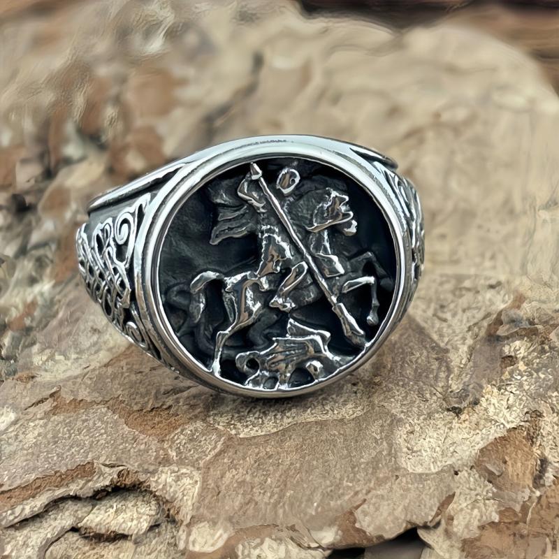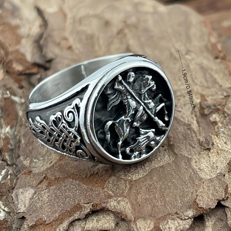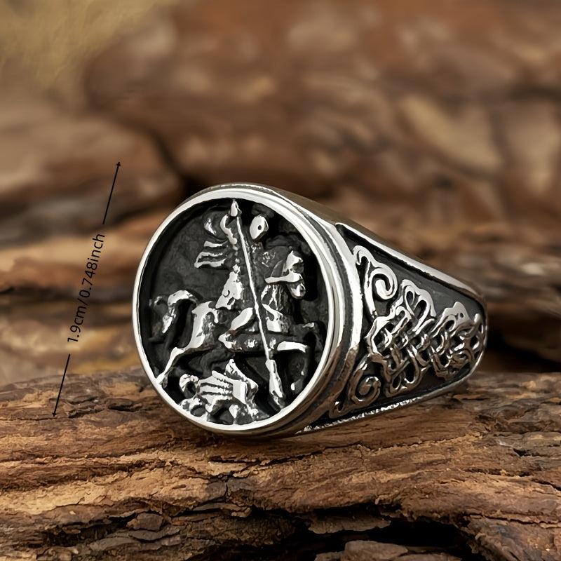 Vintage inspired stainless steel warrior ring featuring an intricate Celtic knot and horse design. Durable and comfortable fit, ideal for casual attire.