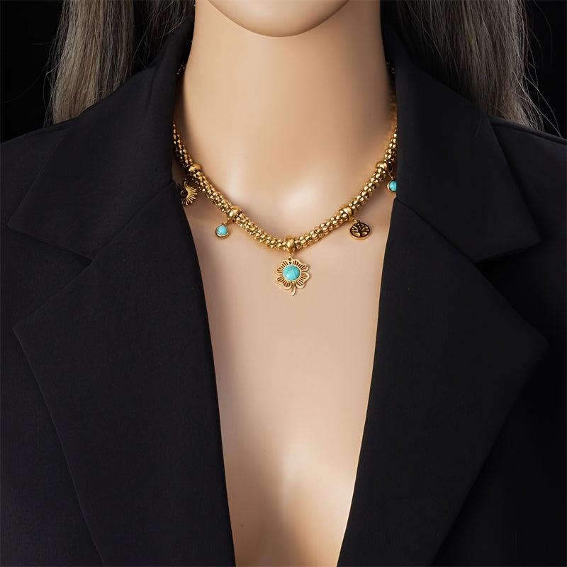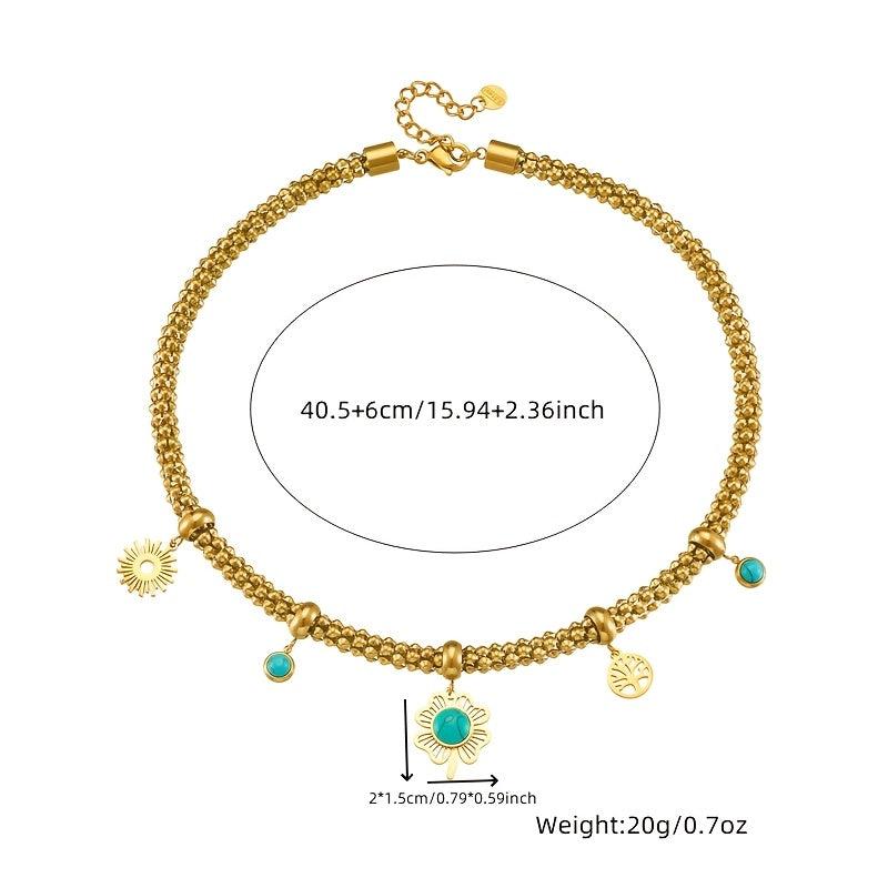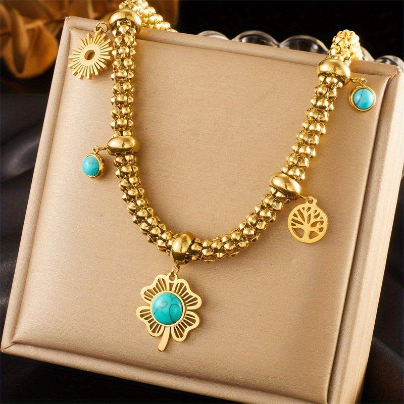This necklace features a thick stainless steel chain with a four leaf clover & tree of life pendant. The necklace is adorned with turquoise beads and sunburst charms, giving it a unique and stylish look. It's suitable for both men and women.