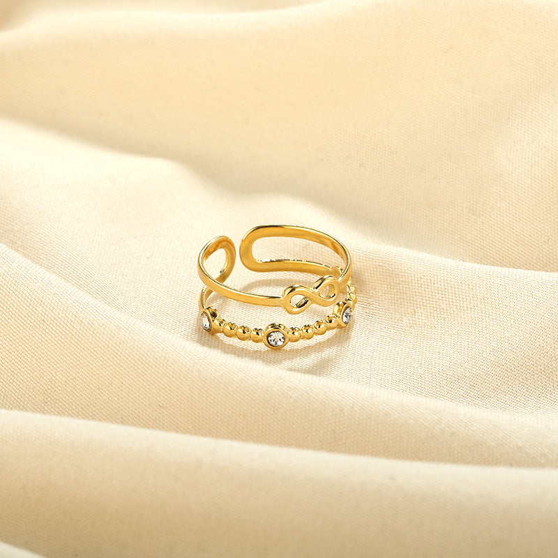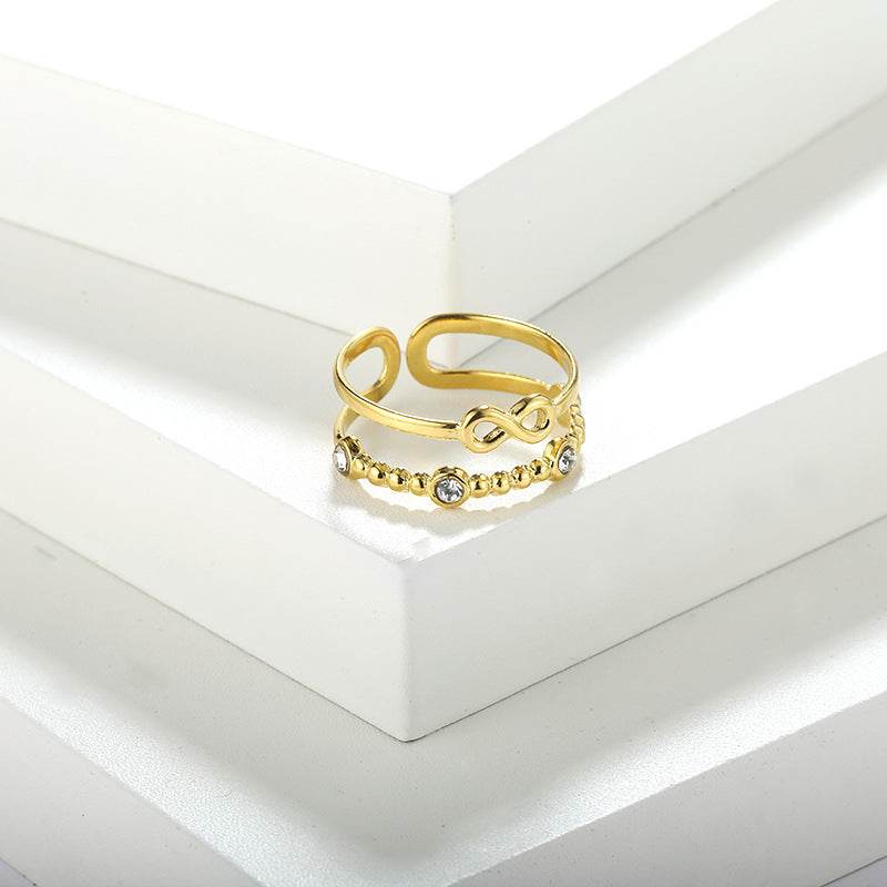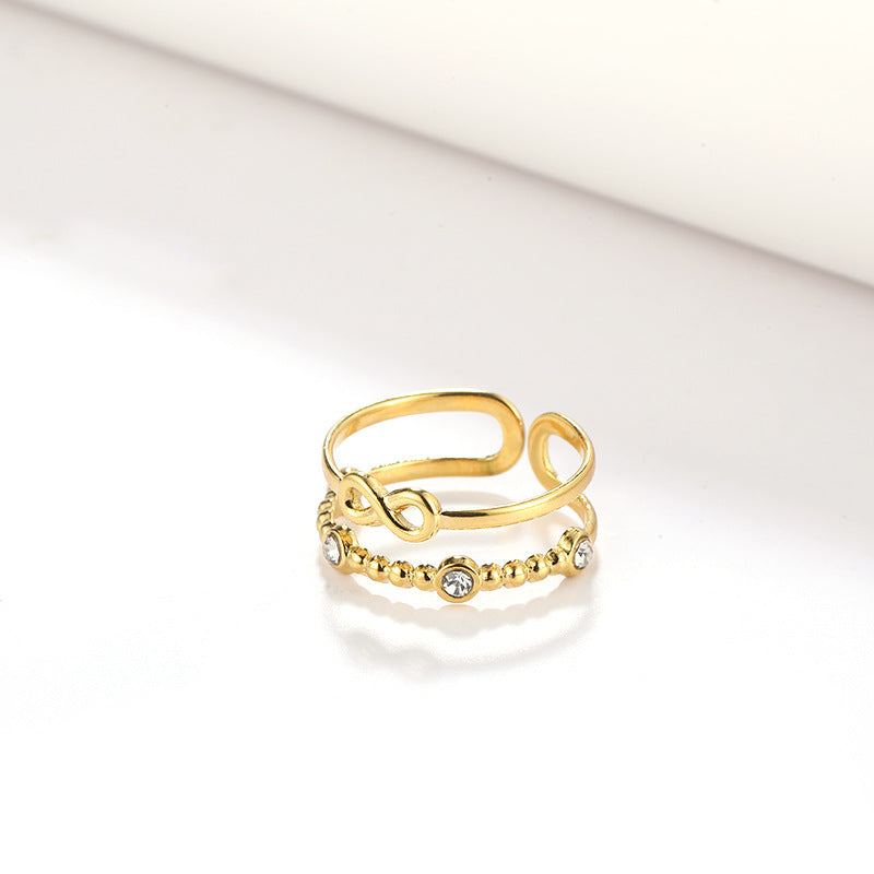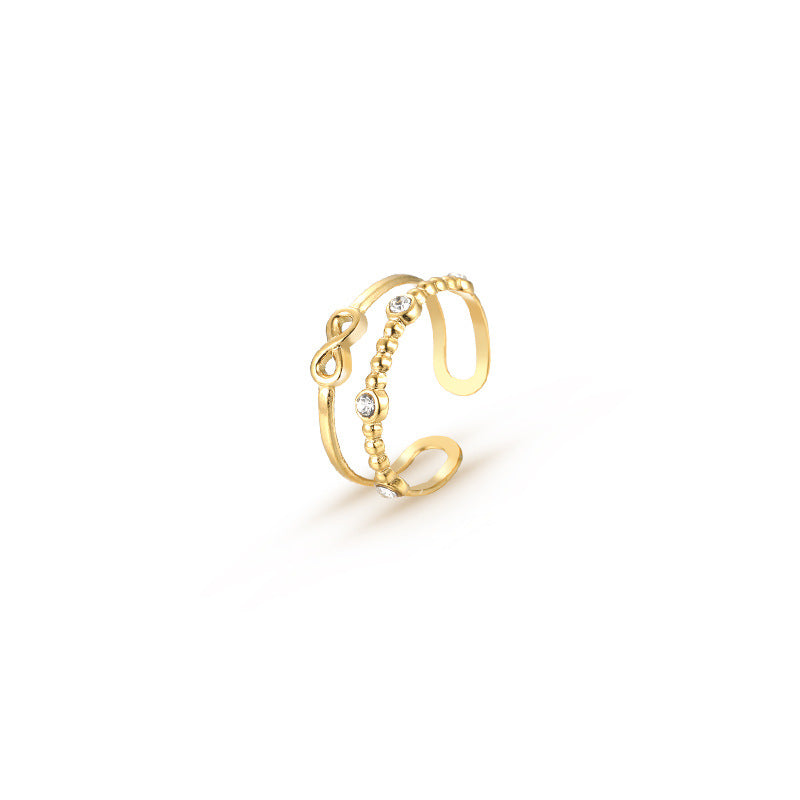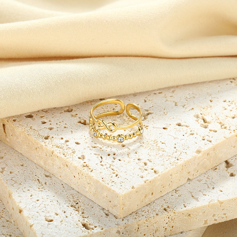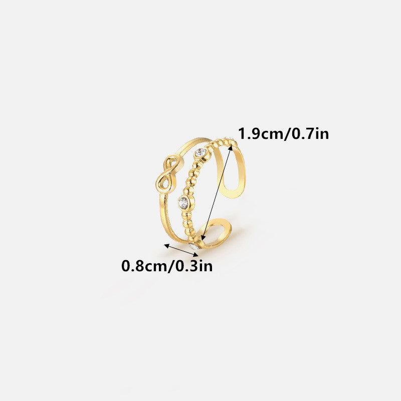 Elevate your daily outfits or party looks with this stunning wide cuff ring made of stainless steel and 18k plated, featuring an inlaid rhinestone infinity sign.