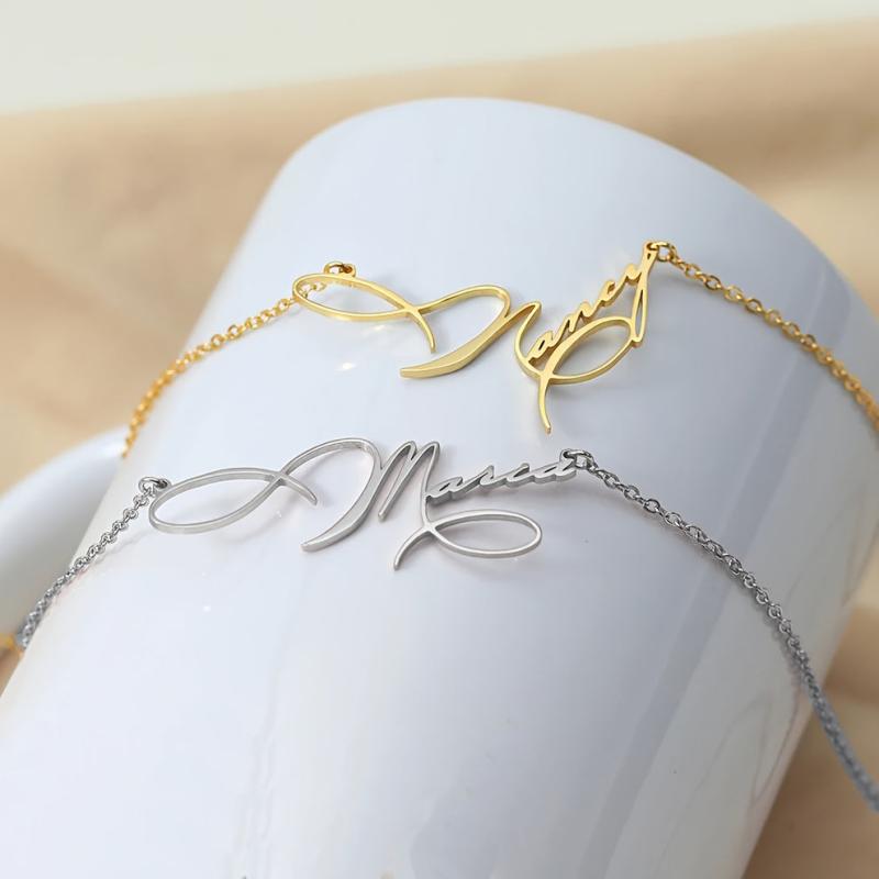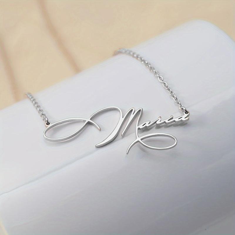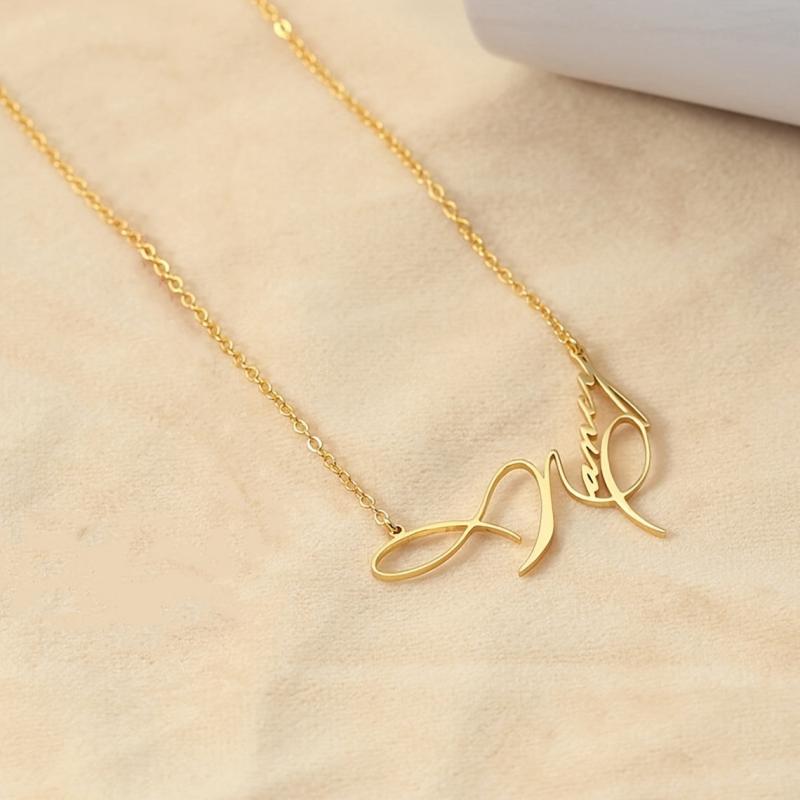 Unique and stylish stainless steel golden name necklace with handwritten artistic font. Personalized and customized pendant for a special touch.