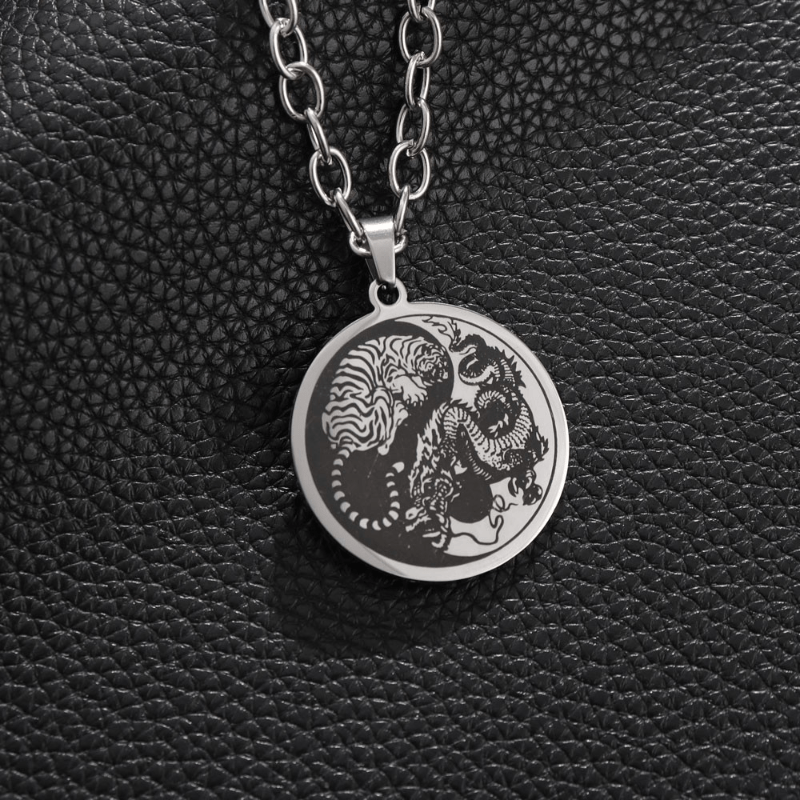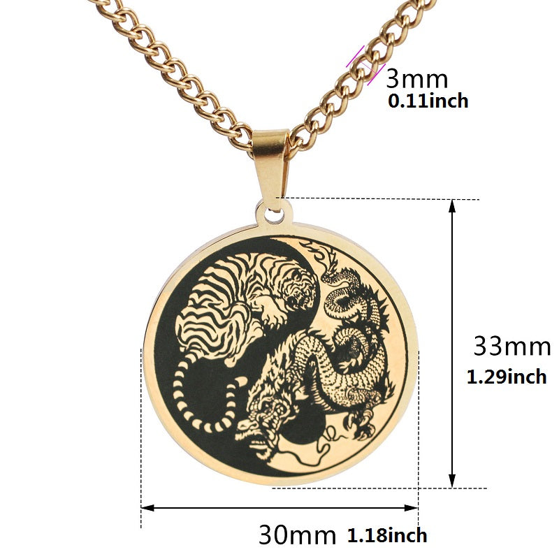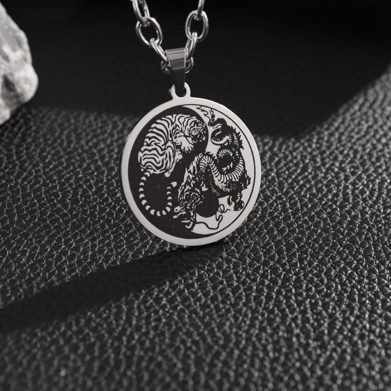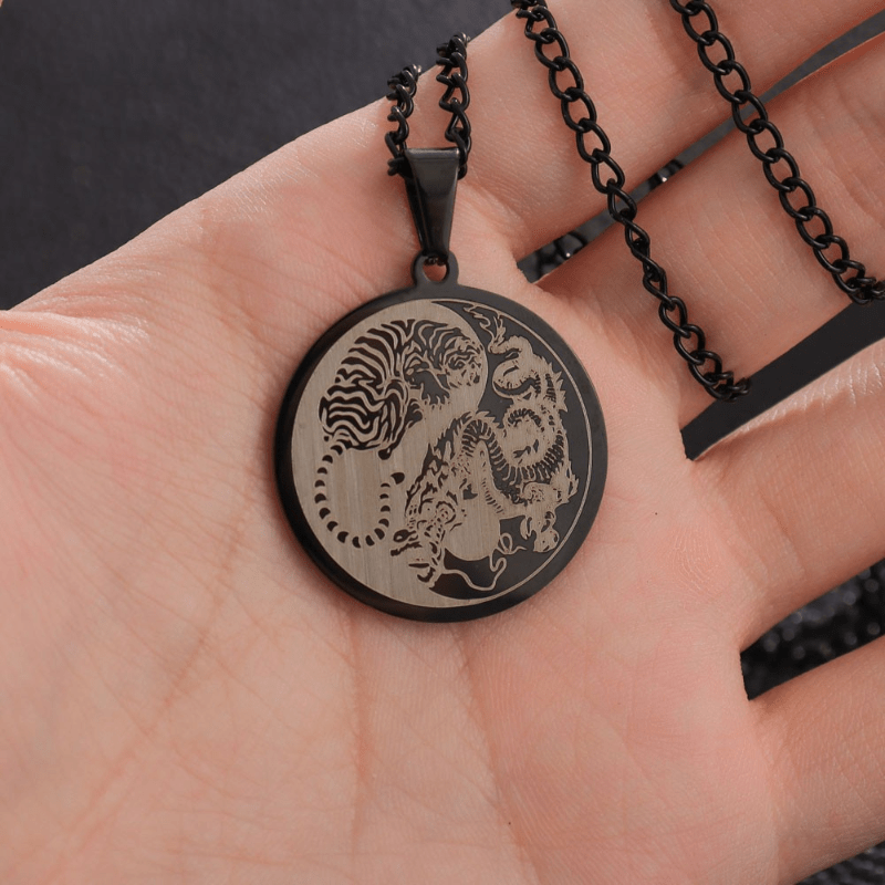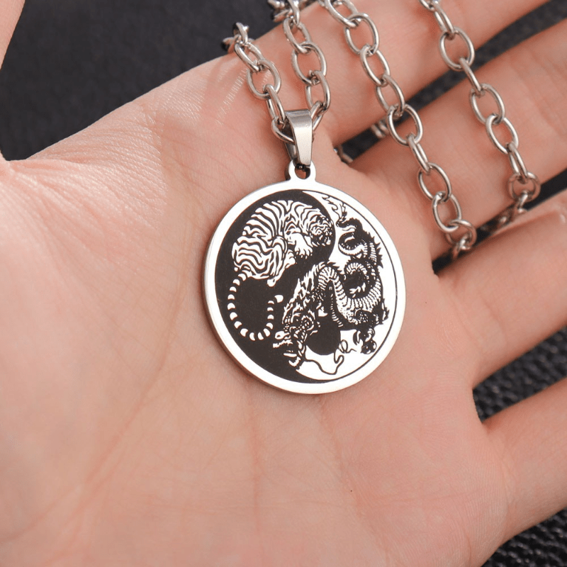 Enhance your style with this stainless steel pendant featuring a domineering dragon and tiger in the Tai Chi symbol. Perfect for men, this necklace is a bold accessory that adds a touch of sophistication to any outfit.