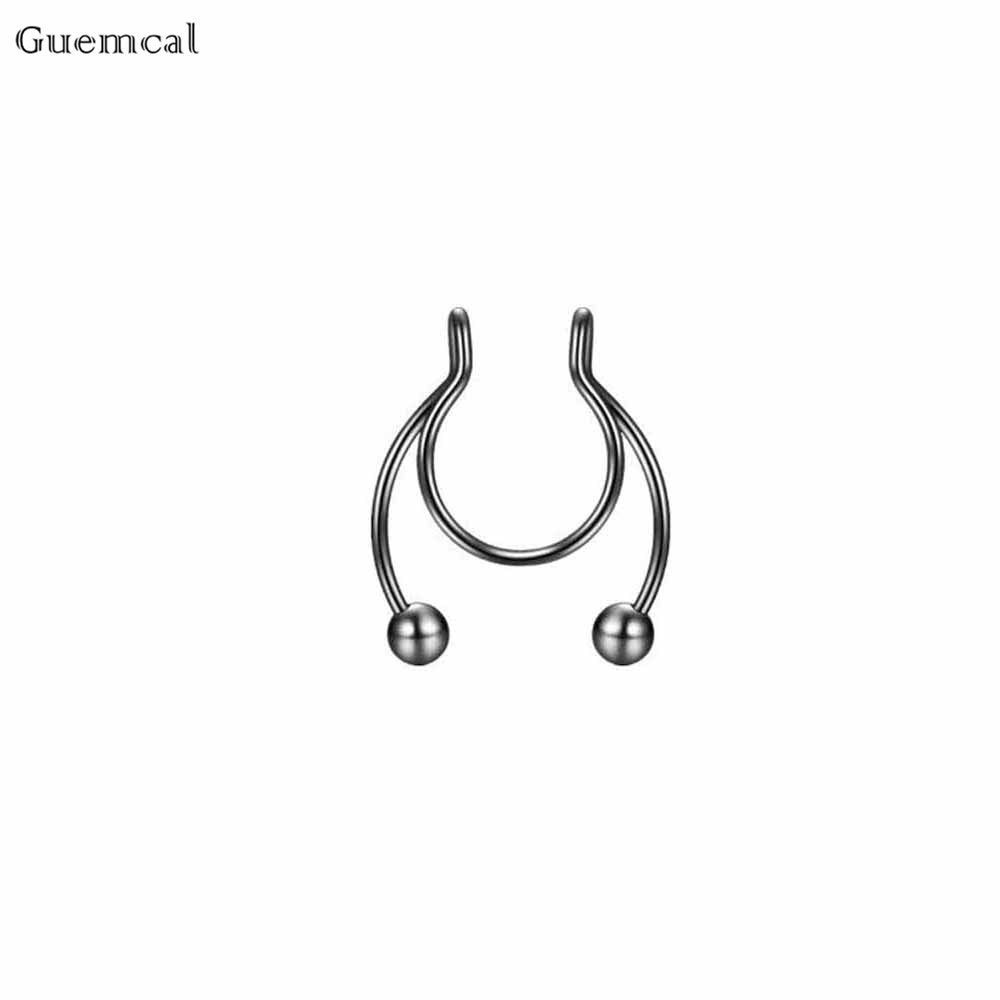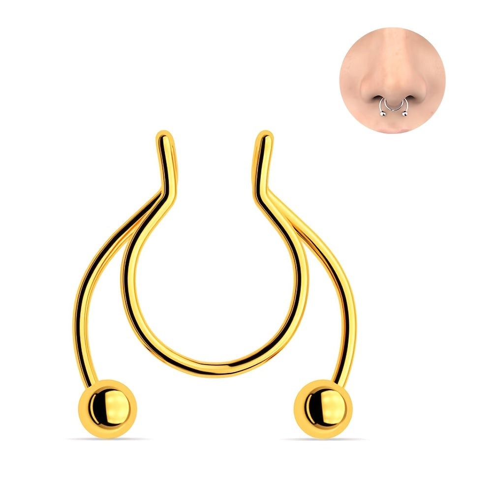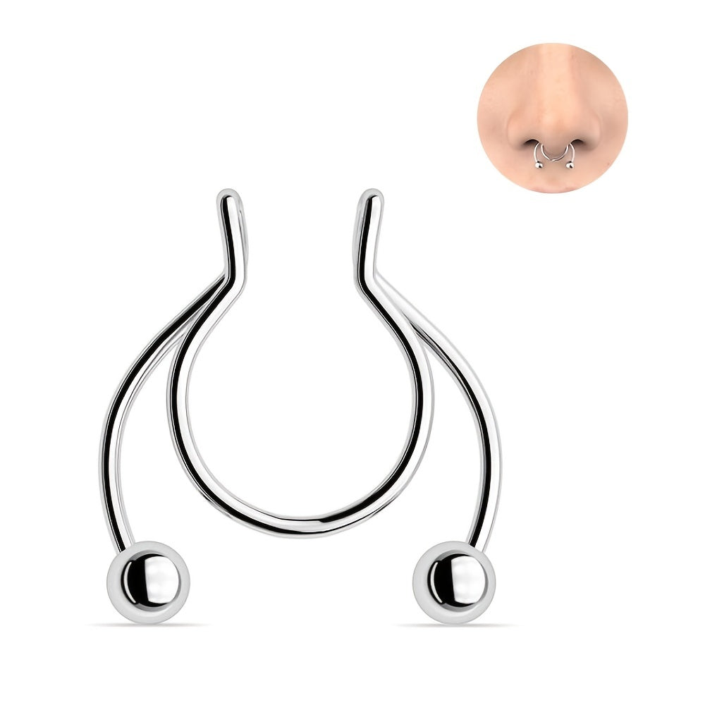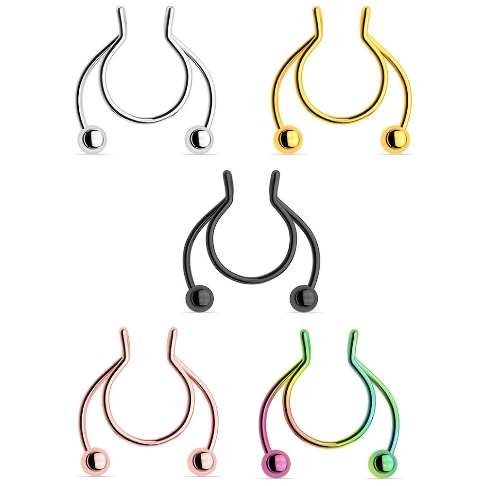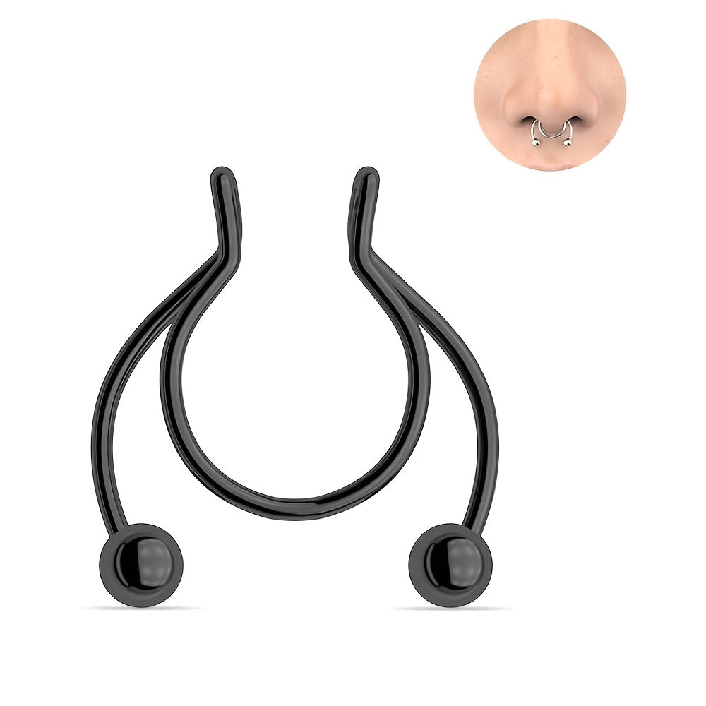 This stainless steel faux septum nose ring is perfect for men who want to add a stylish accessory to their look without the need for a piercing. Made of high-quality stainless steel, this non-piercing nose ring is durable and long-lasting. It features a sleek design that mimics the look of a real septum piercing, giving you a trendy and edgy style.