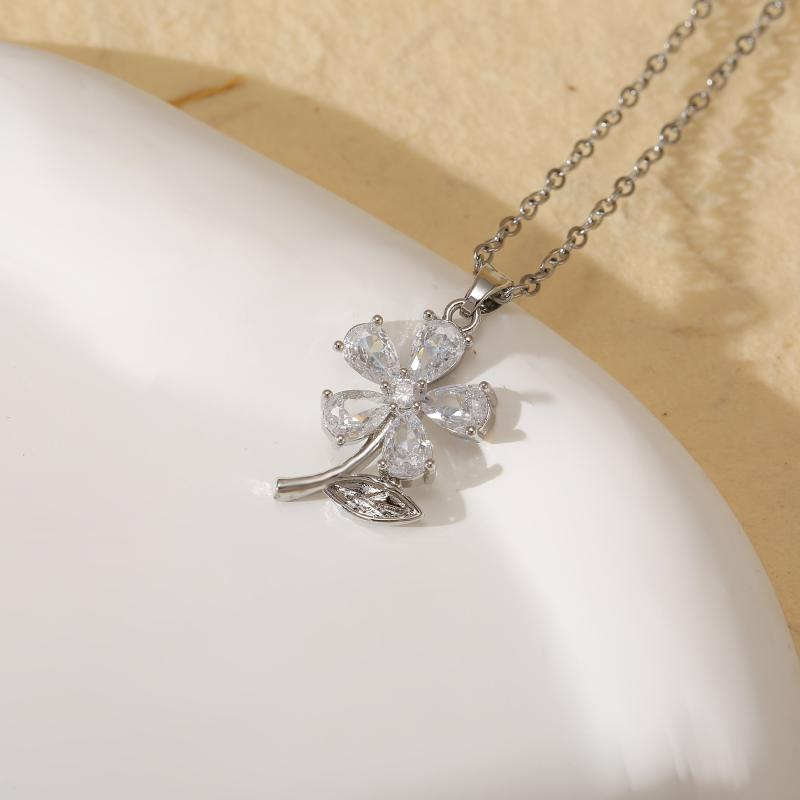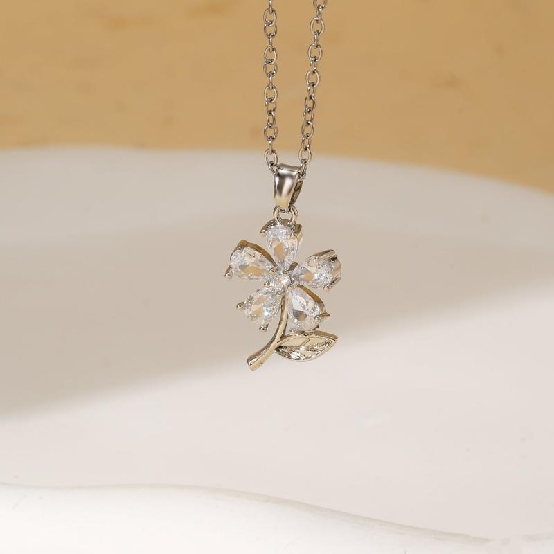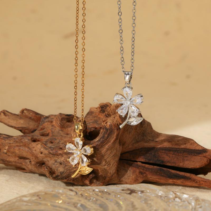 Adorn yourself with this stunning stainless steel necklace featuring a flower pendant with cubic zirconia. Perfect for various occasions like parties, beach days, holidays, or everyday wear.