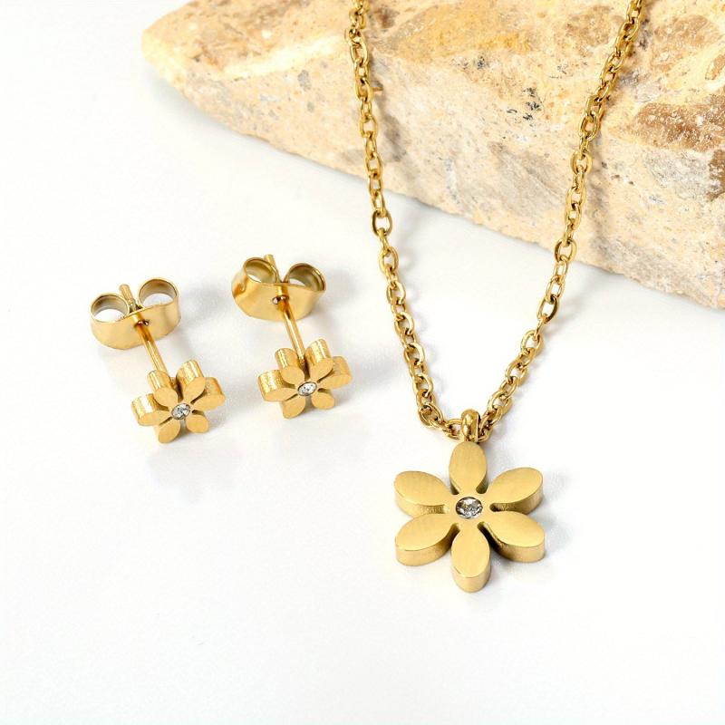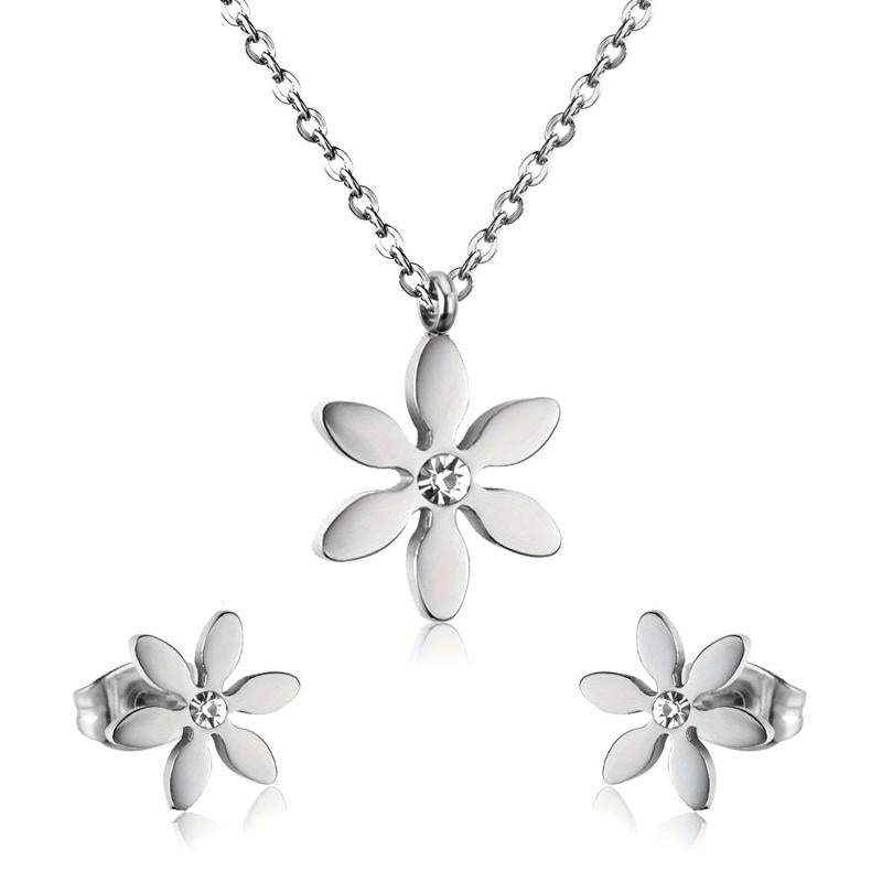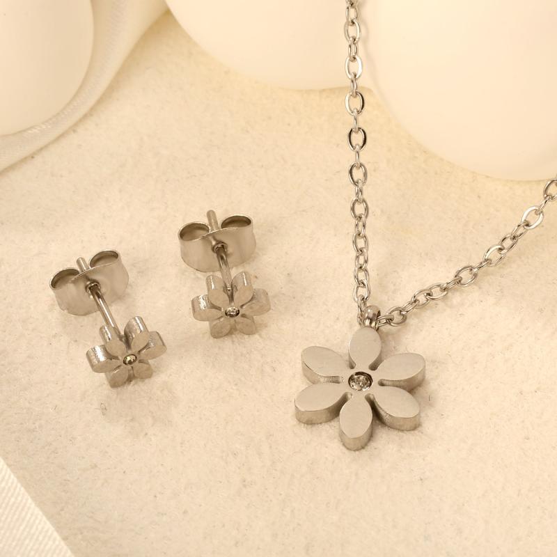 Elegant stainless steel jewelry set featuring a flower design. Perfect for a chic and stylish look.