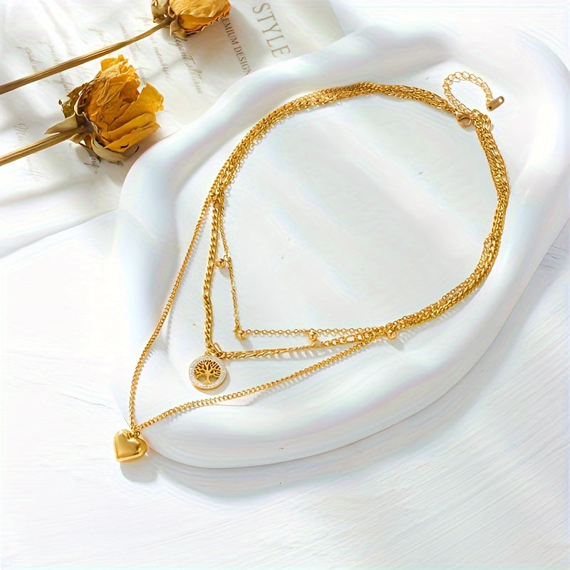 This necklace features a triple-layer design with a golden plated tree and heart shape pendant. It is a stylish and elegant accessory for men.