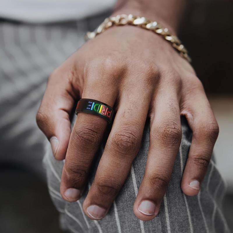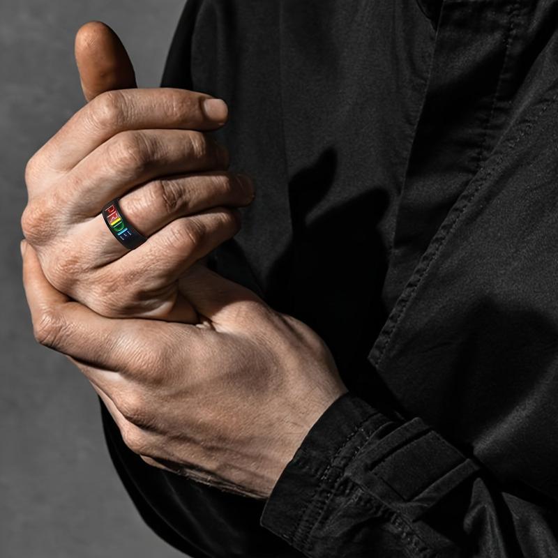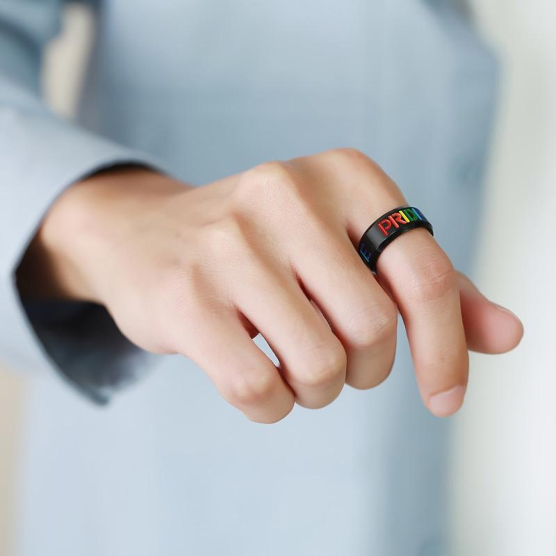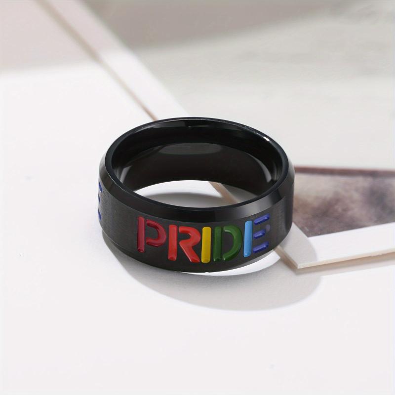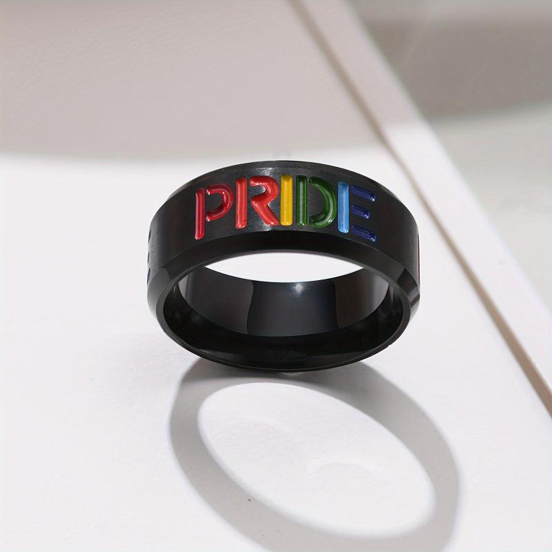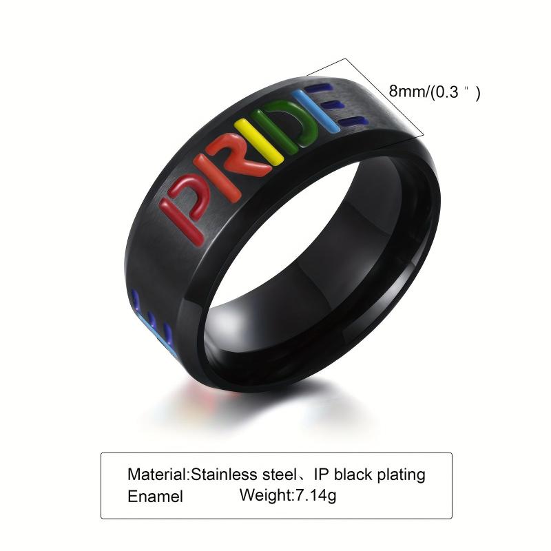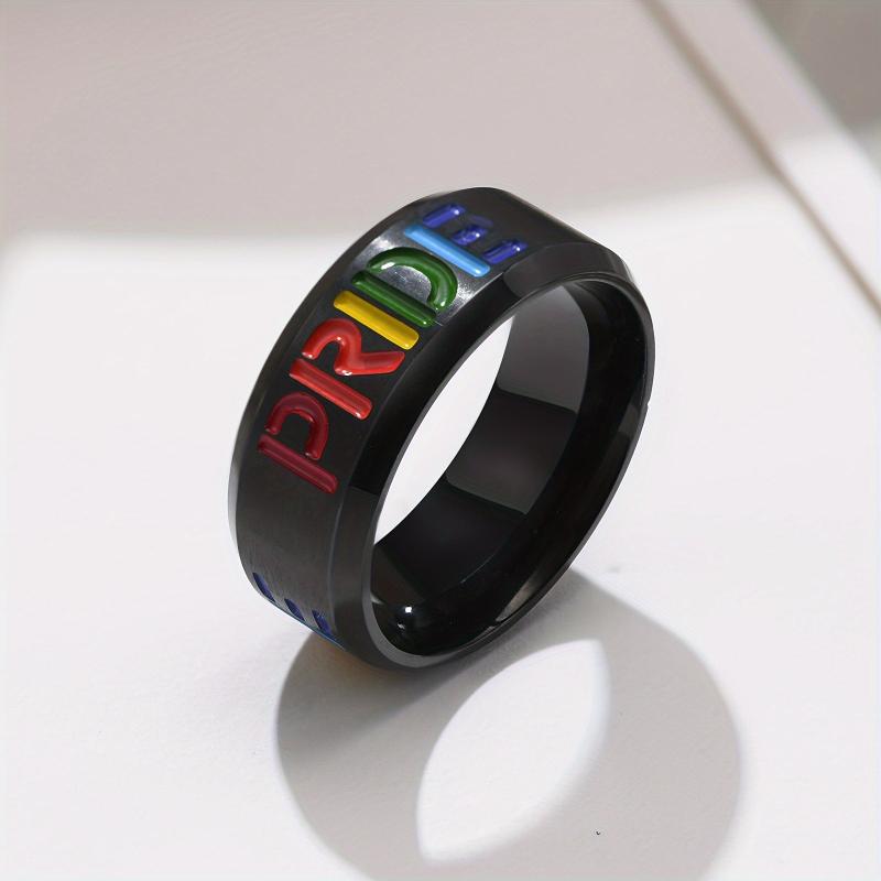This stainless steel rainbow enamel ring is a perfect symbol of pride. The rainbow letter design adds a colorful touch. It's a great gift for someone special.