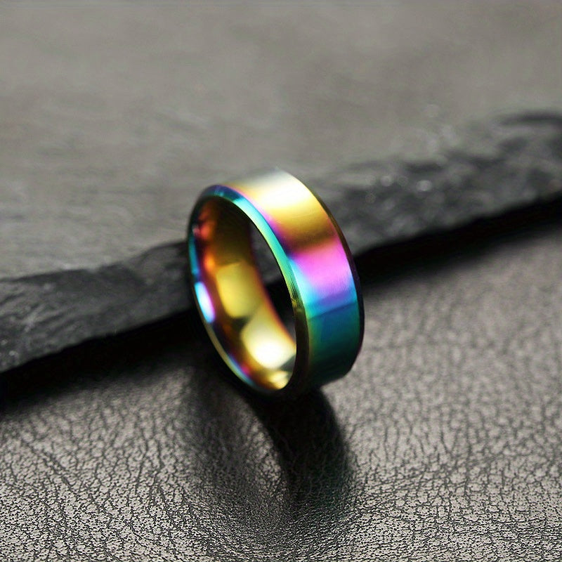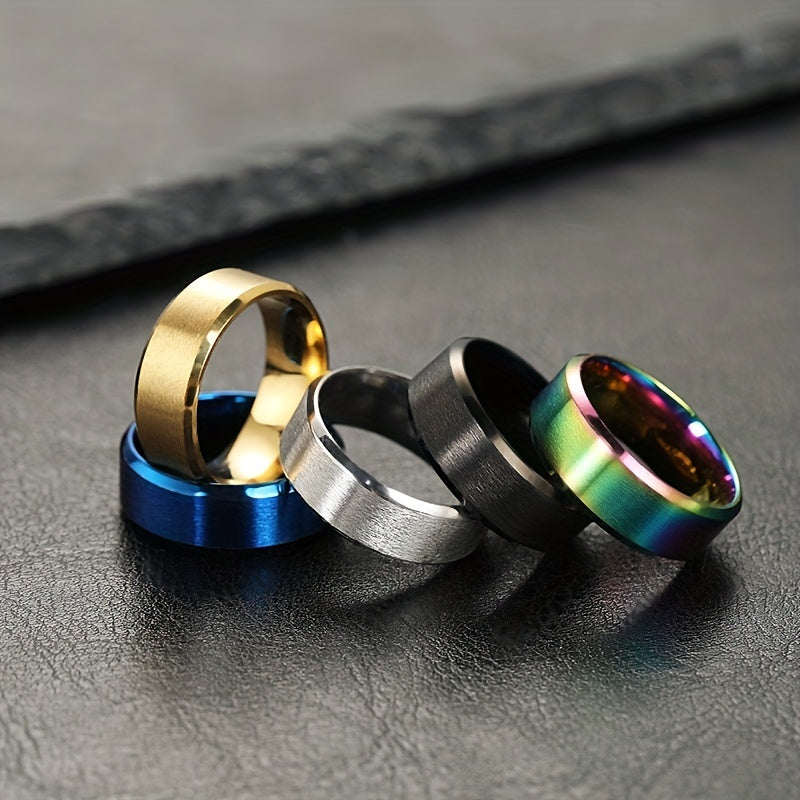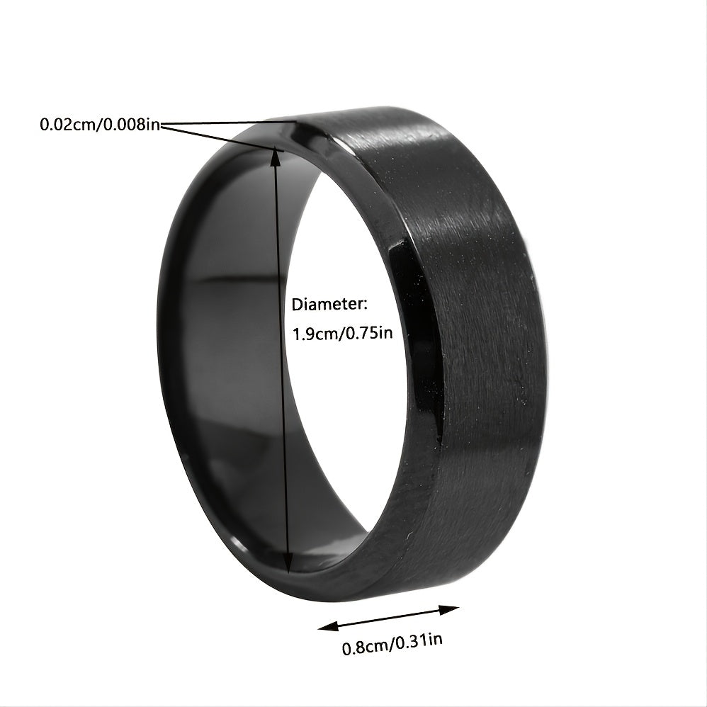 This stainless steel ring features a sleek matte finish with beveled polished edges for a modern look. Its comfort fit design ensures a smooth and comfortable wearing experience.