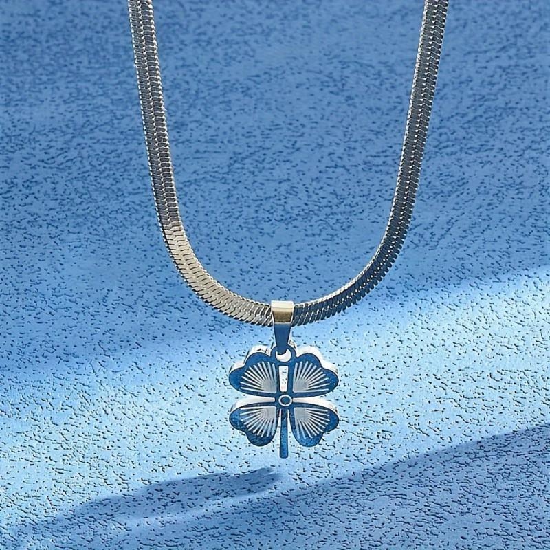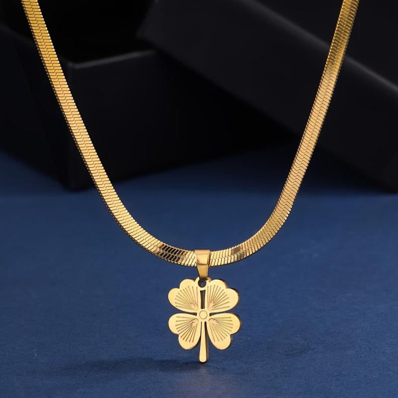 Elegant and trendy snake bone chain with a four leaf clover pendant, perfect for daily wear as a stylish accessory.