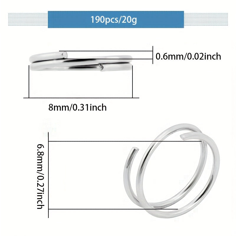 This pack contains 270pcs of 304 stainless steel split rings with a diameter of 8mm, ideal for jewelry making and other crafts.