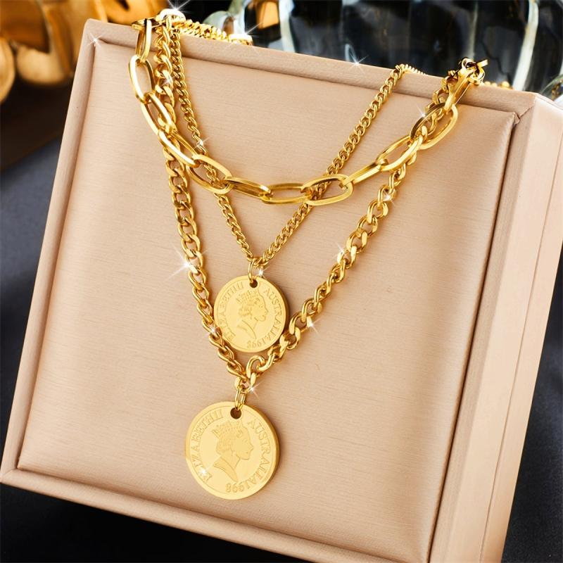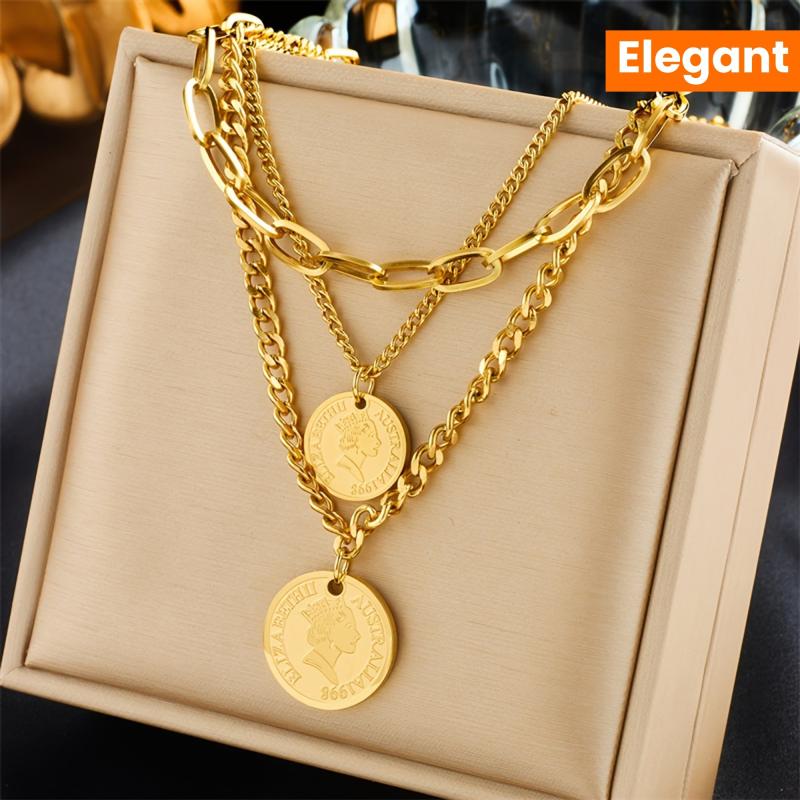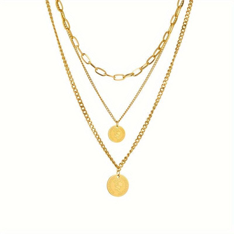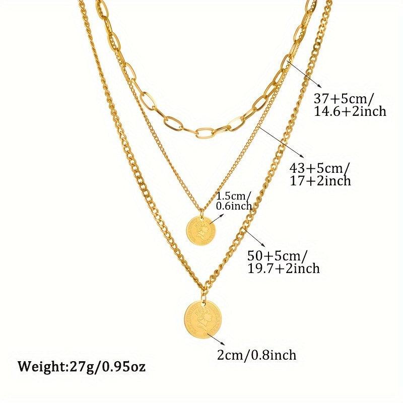 Add a touch of retro charm to your outfit with this stainless steel necklace featuring a triple layered design and coin pendant. Versatile accessory for women.