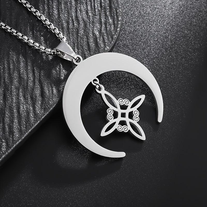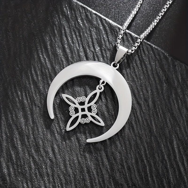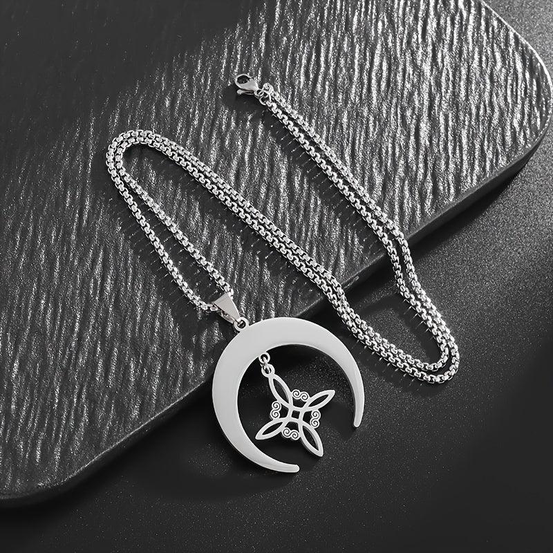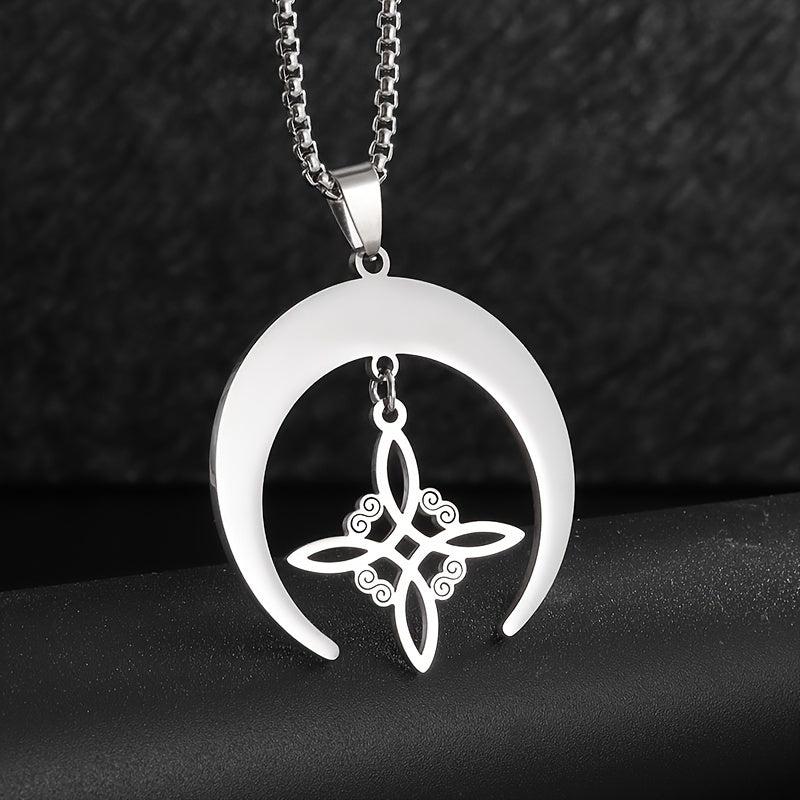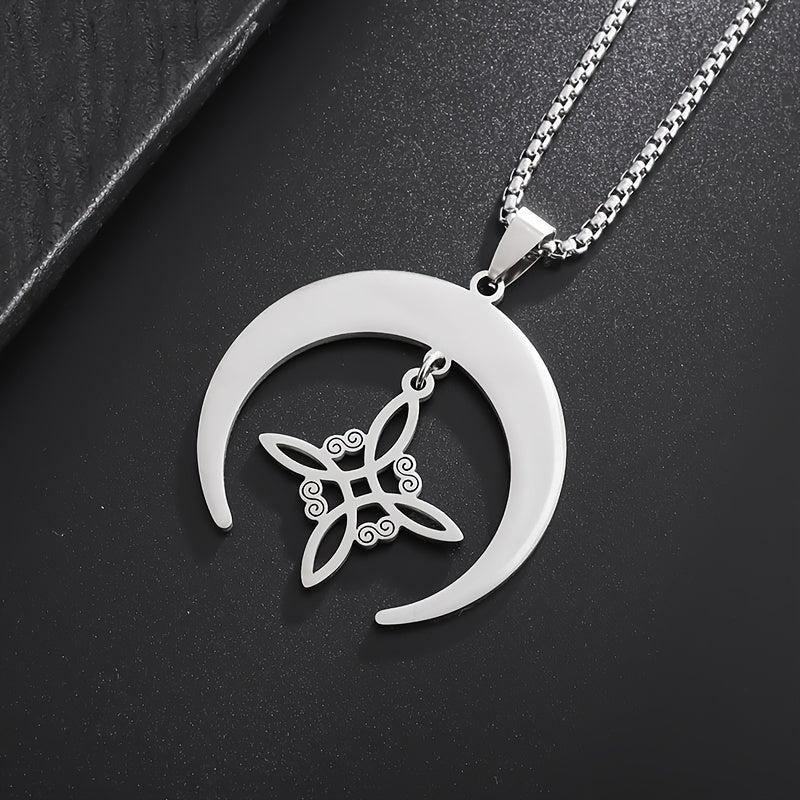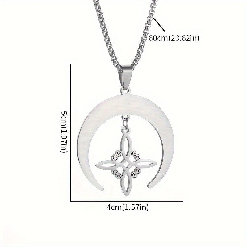 This stainless steel pendant necklace features a witch knot moon symbol with intricate Celtic knot and floral design, suitable for both men and women. It is durable for everyday wear and adds a touch of symbolism to any outfit, perfect for parties or casual occasions.