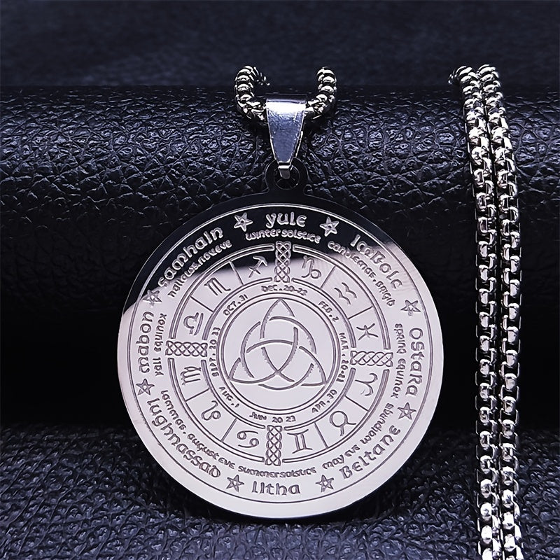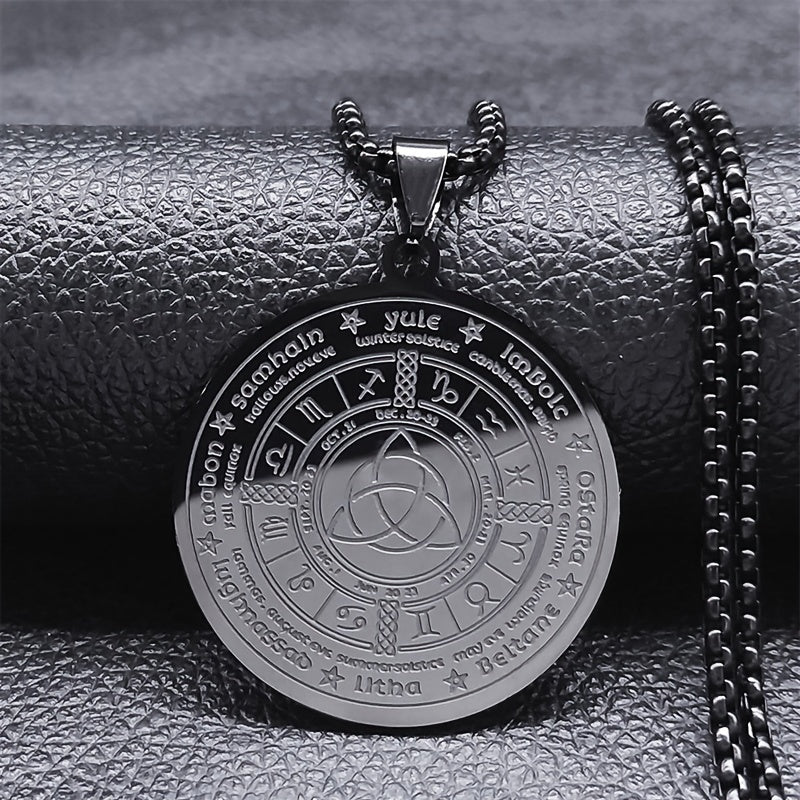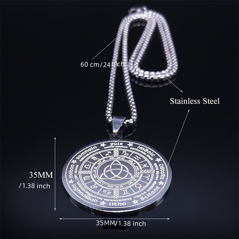 This round stainless steel necklace features a witch theme design and is plated with 14K gold. It is a stylish and lucky accessory to wear.