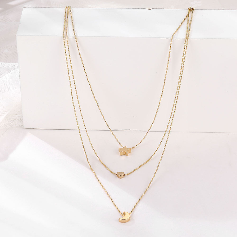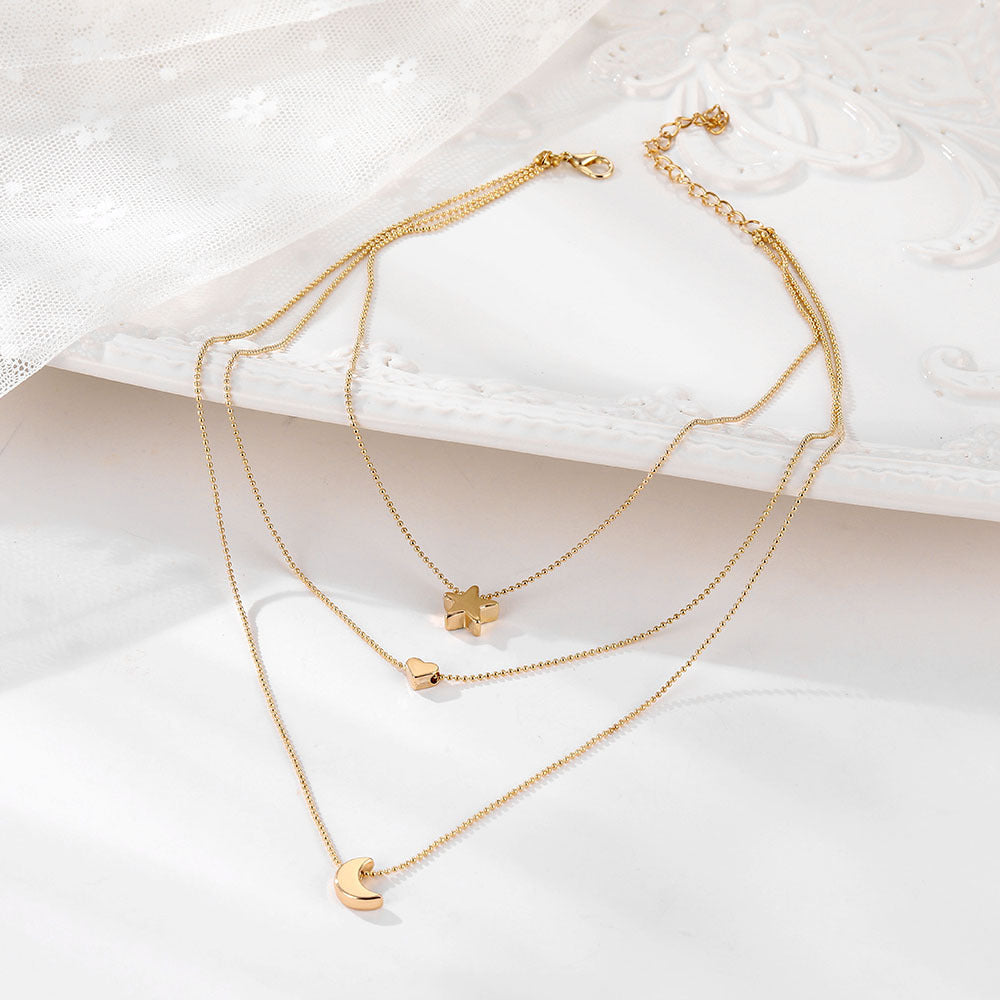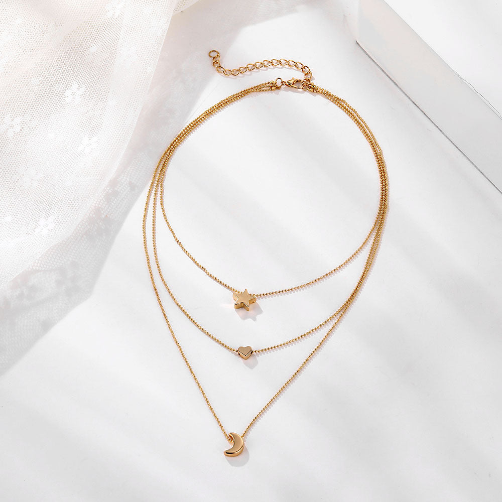 Express your love with this beautiful multilayer necklace featuring star, moon, and love pendant. A perfect accessory for any outfit.