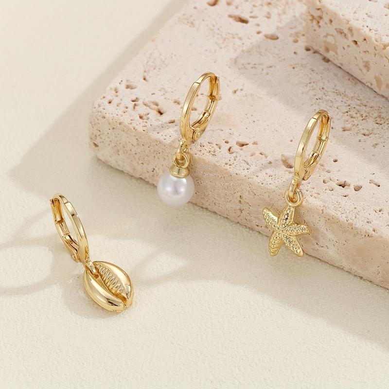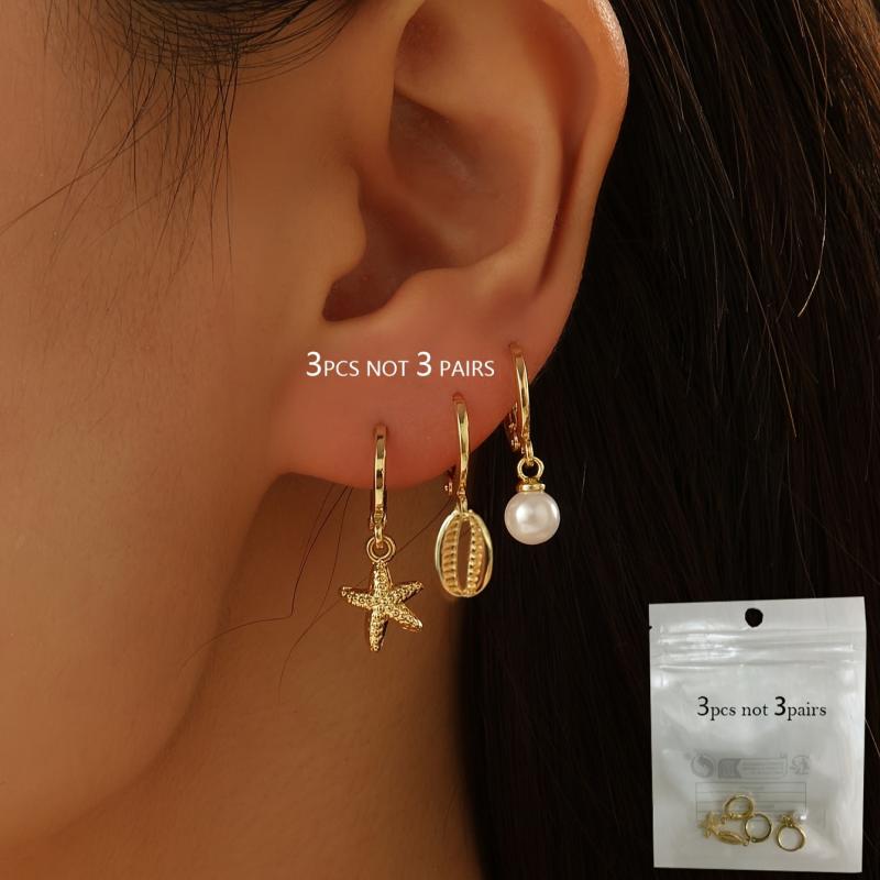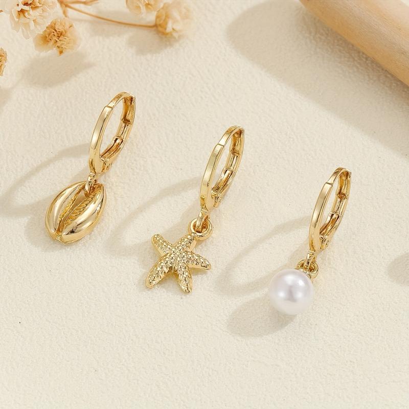 Add a touch of beachy charm to your look with this 3-piece earring set featuring starfish and conch shell designs. Perfect for a day at the beach or a summer vacation.