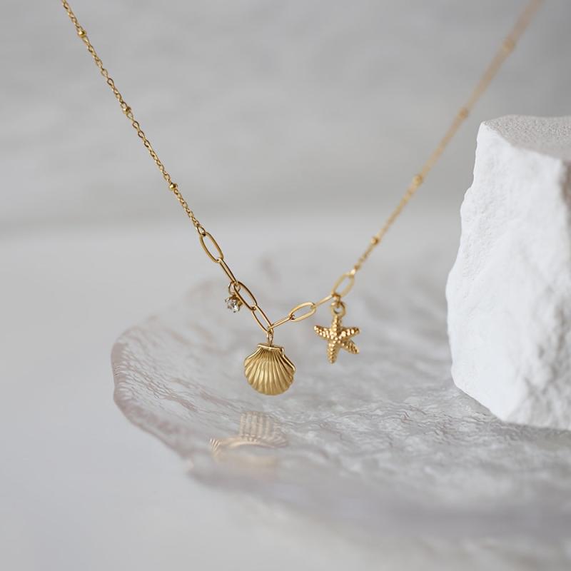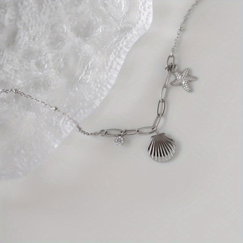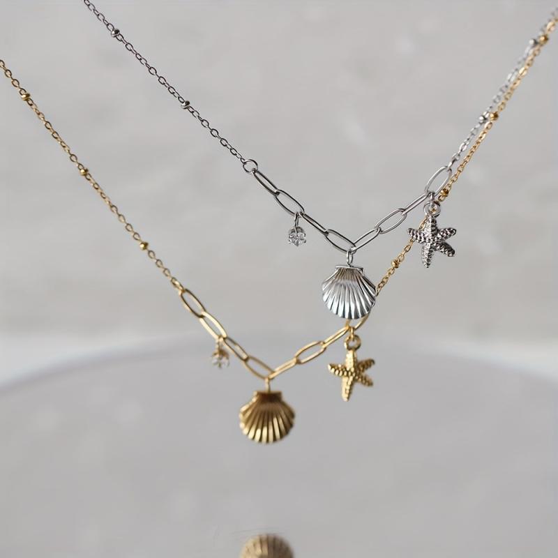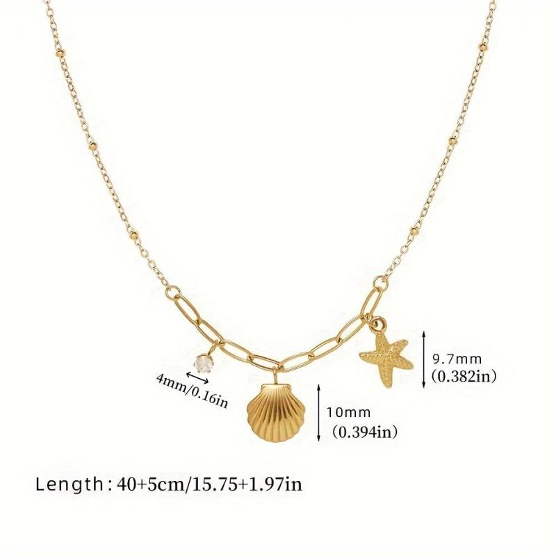 Capture the essence of summer with this stainless steel necklace featuring interconnected starfish and seashell pendants. Perfect for vacations or everyday wear.