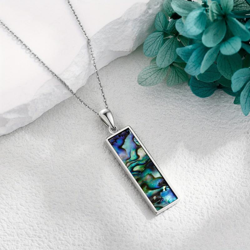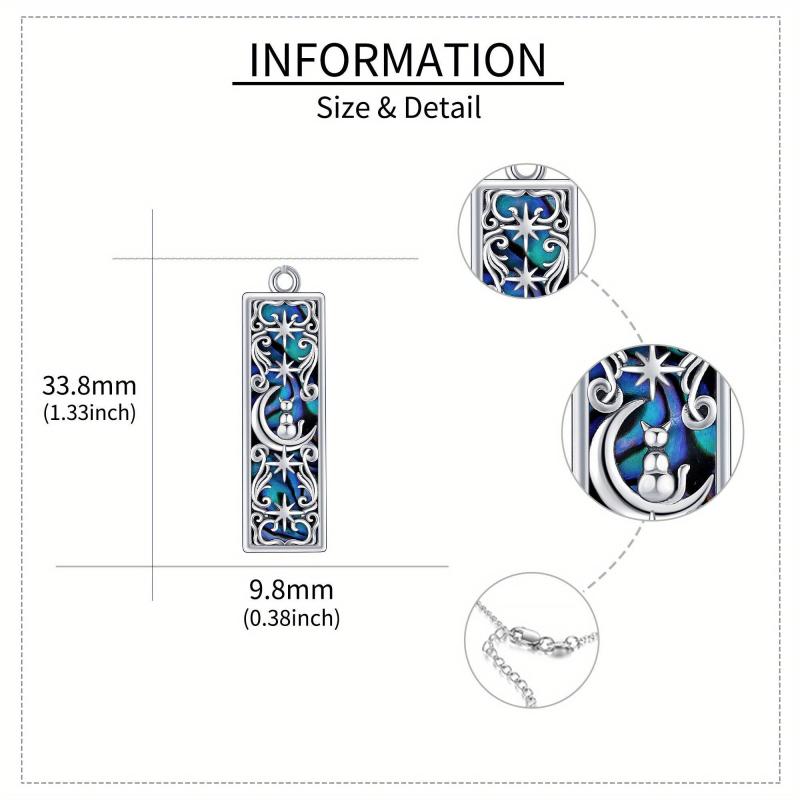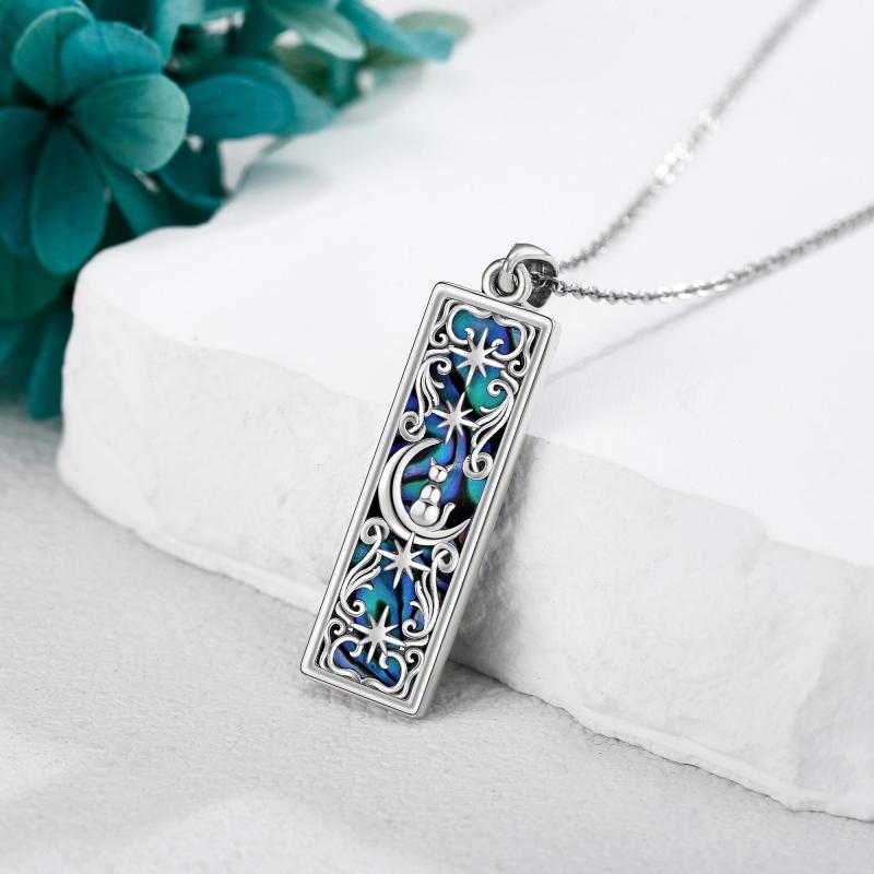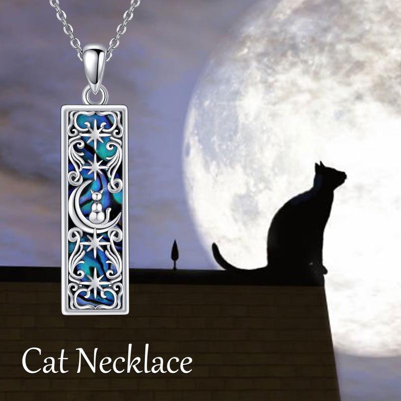 This stunning necklace features a sterling silver cat pendant with synthetic abalone shell, perfect for cat lovers.