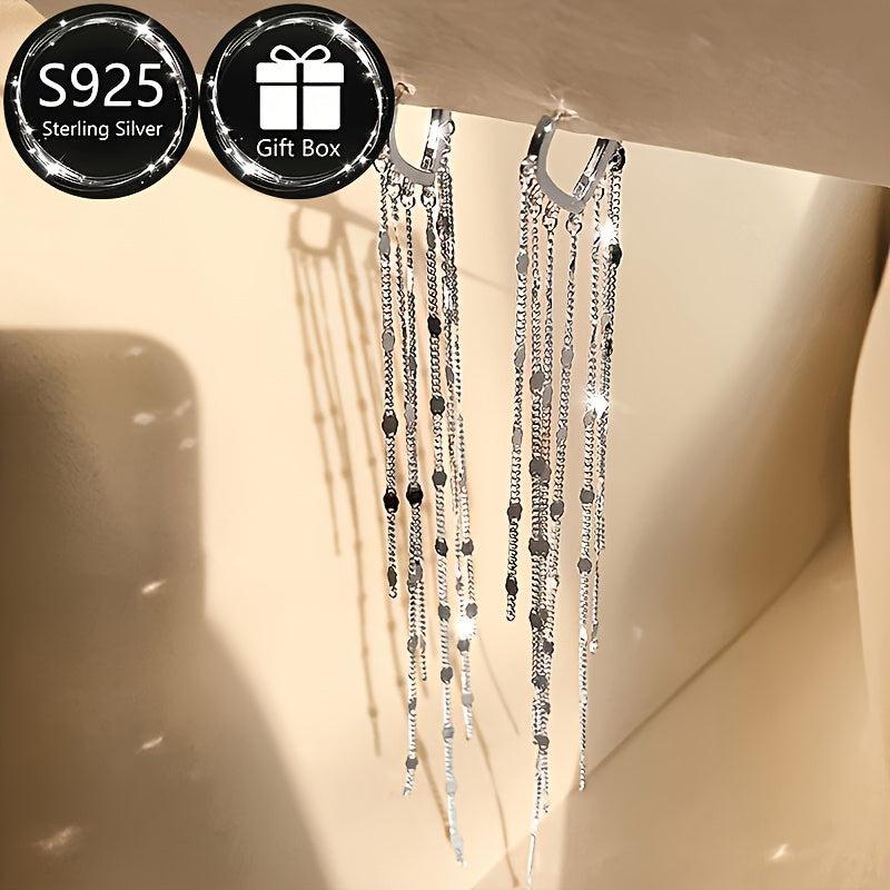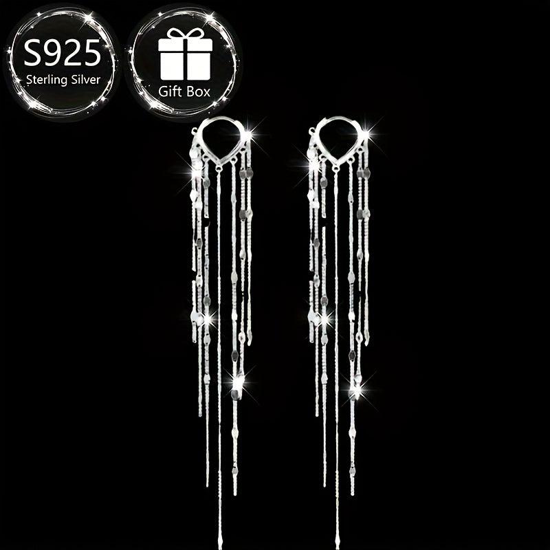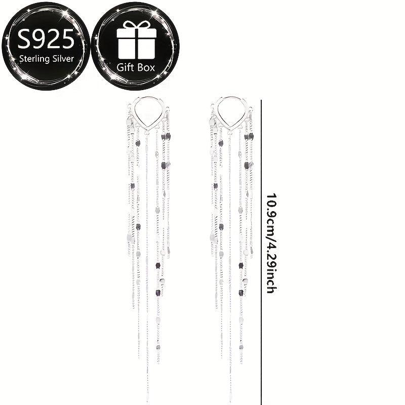 Add a touch of glamour to your outfit with these stunning sterling silver dangling earrings featuring sparkling rhinestones and a long tassel design. Perfect for weddings, parties, or everyday wear. Makes a great gift for Mother's Day or any special occasion.