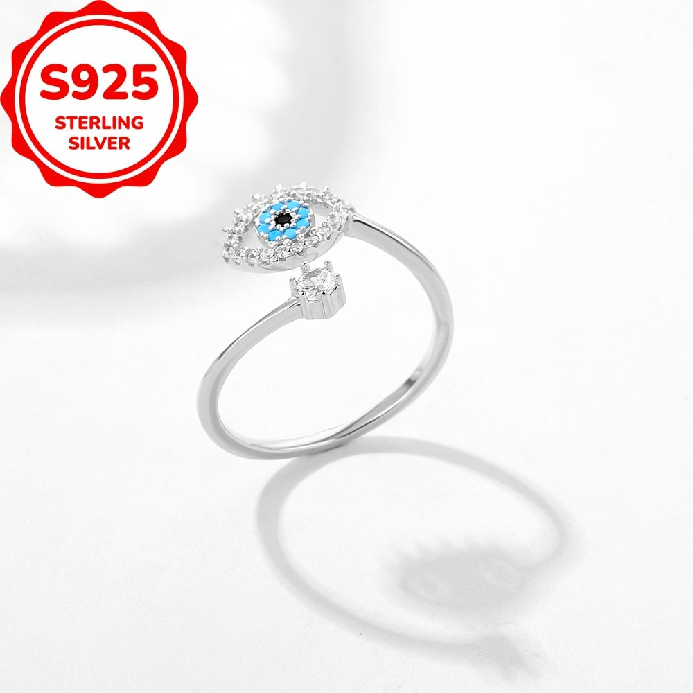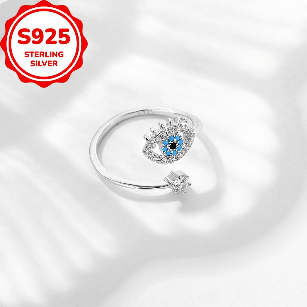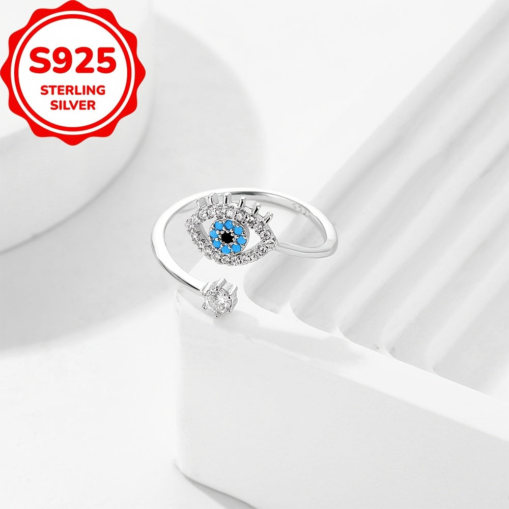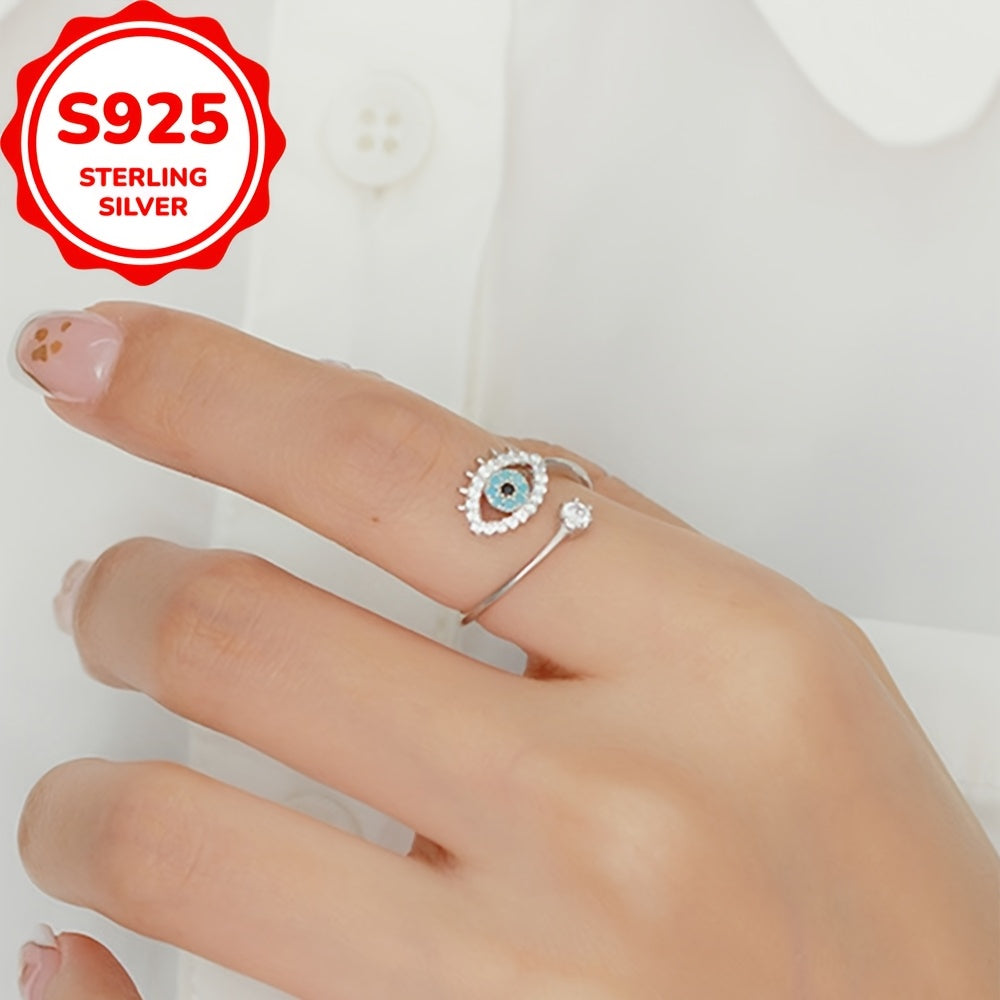 This S925 sterling silver ring features a devil's eye opening design with synthetic zirconia decoration, perfect for holiday dressing or as a blessing ring.