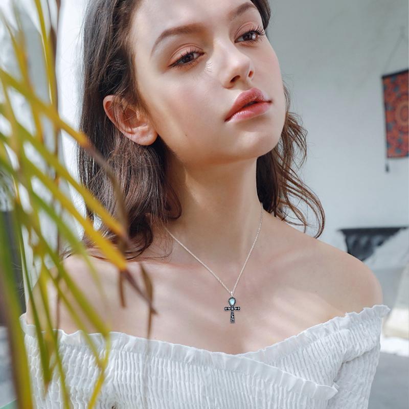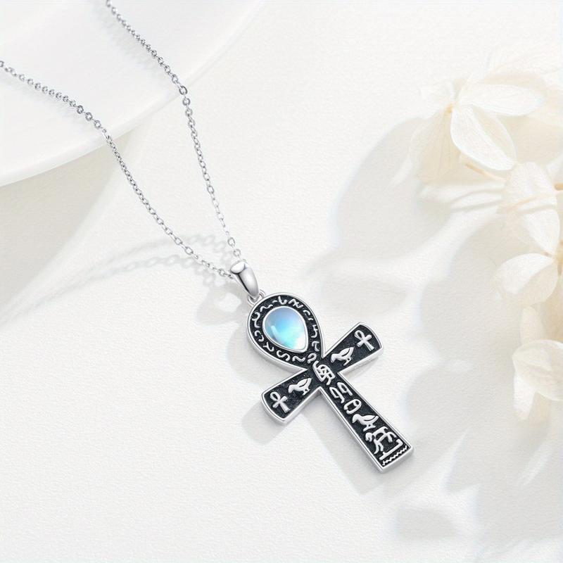 This Ankh necklace for women is made of 925 sterling silver and features a moonstone with ancient Egyptian hieroglyphs. A beautiful amulet jewelry piece for women and teens.