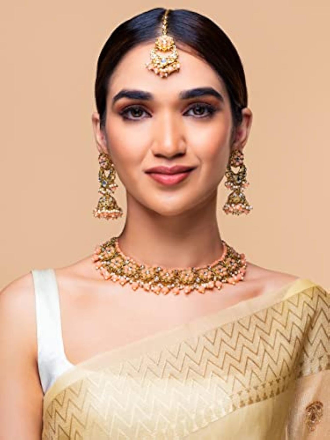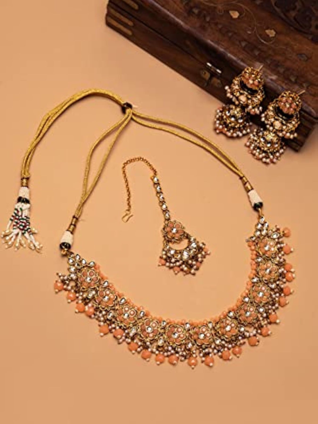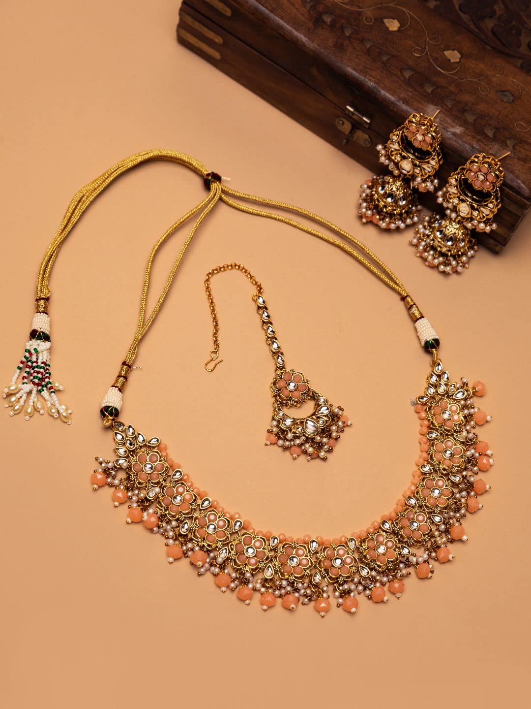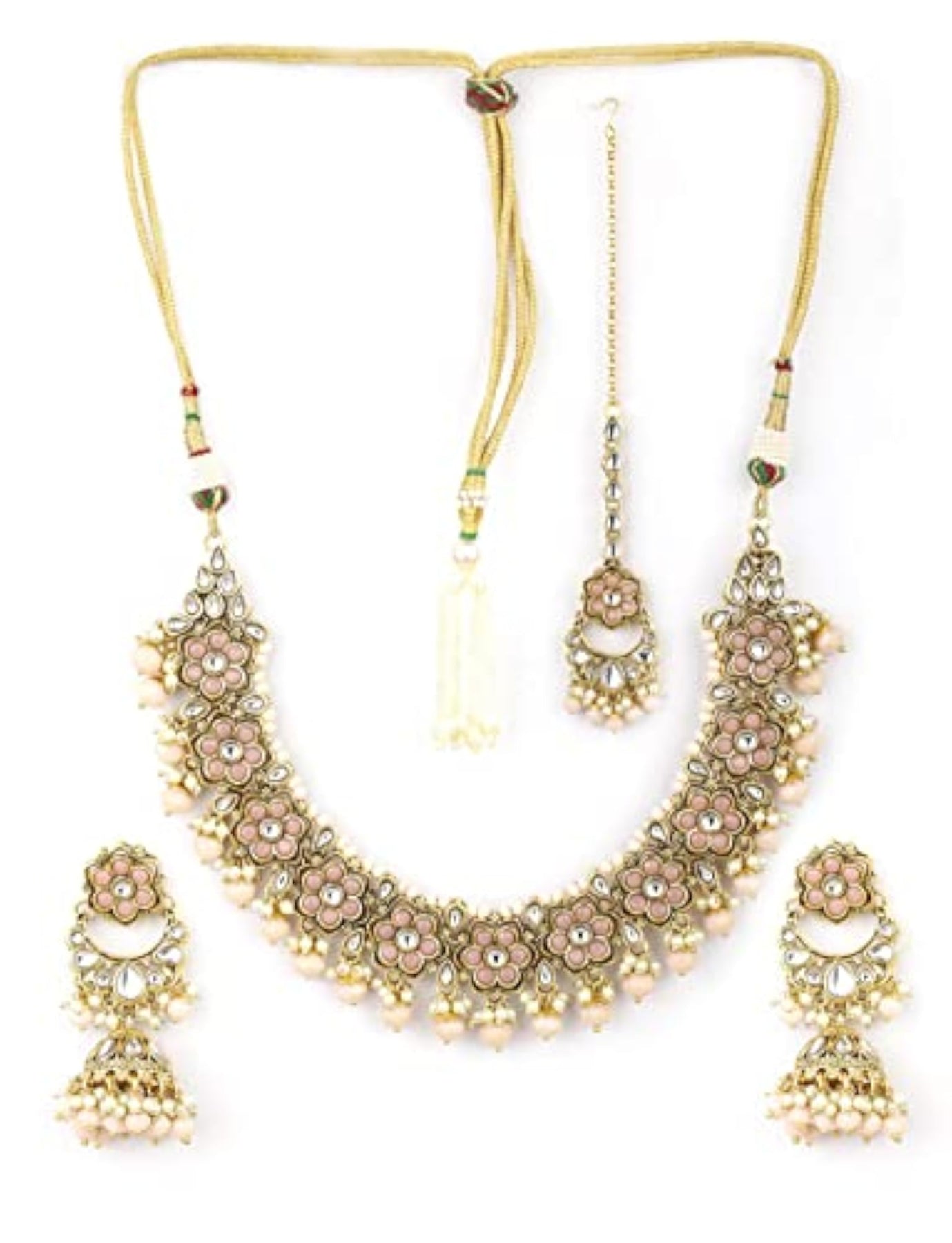 Enhance your bridal look with this stunning stone jewellery set that includes a studded flower design necklace, earrings, and a maangtika. Perfect for weddings and special occasions.