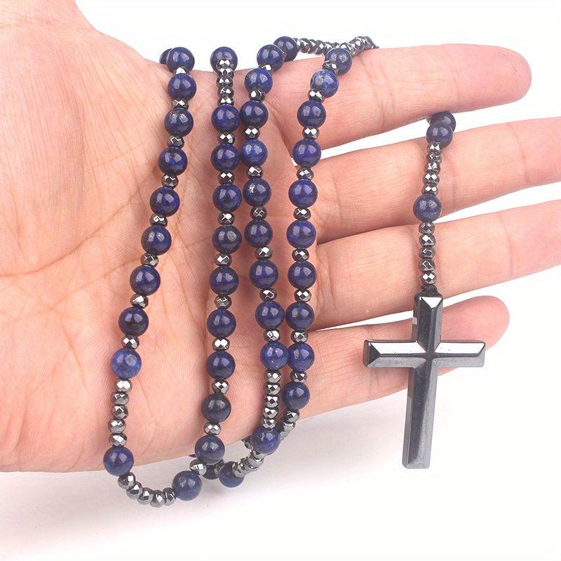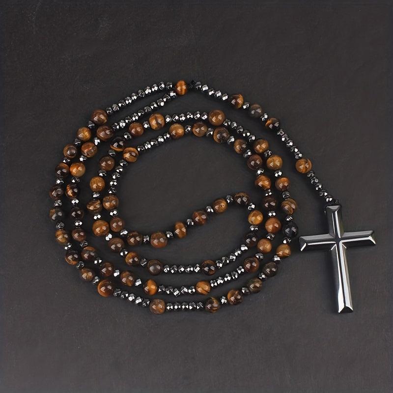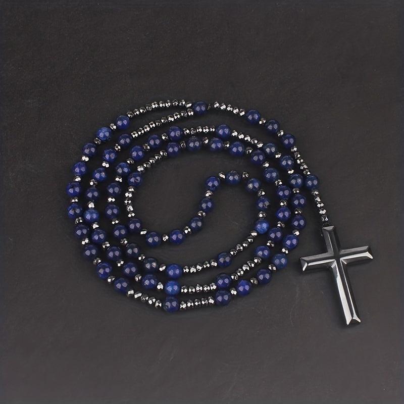 This rosary necklace features natural stone tiger eye and lapis glitter stones along with a round bead cross pendant. It is a stylish and meaningful accessory for men.