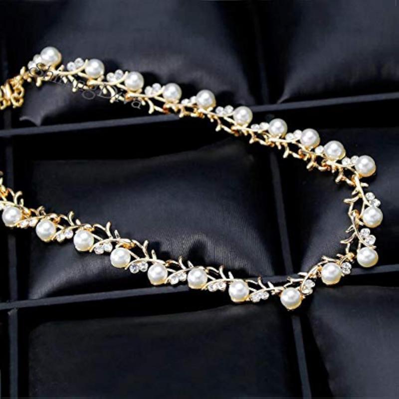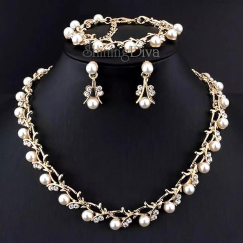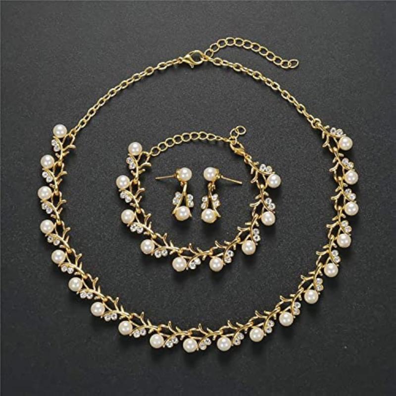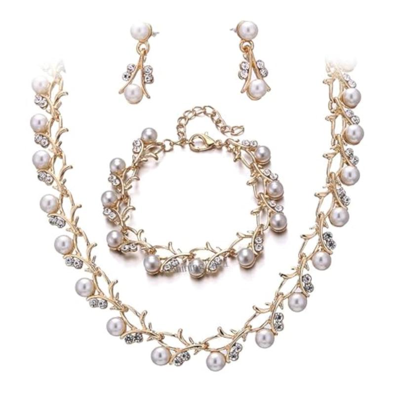 This stunning jewellery set includes a necklace, earrings, and bracelet, all plated with 18k gold and adorned with elegant pearls.