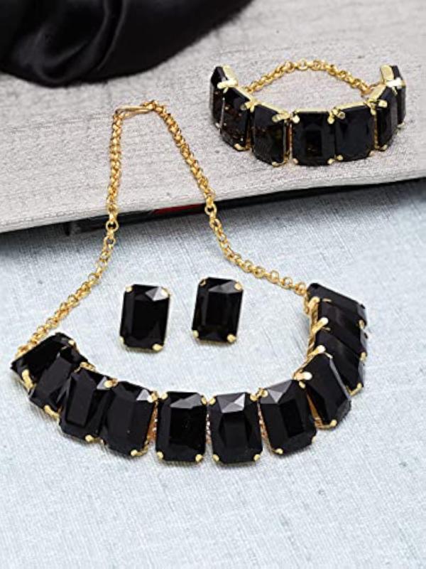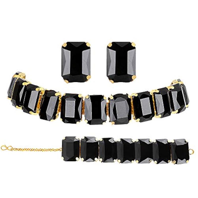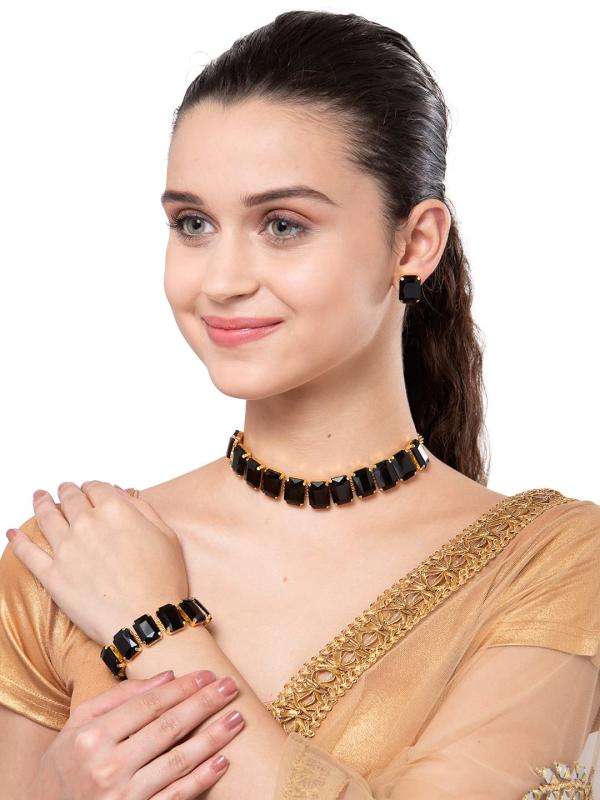 Elevate your look with this stunning traditional jewellery set featuring a choker, bracelet, earrings, and necklace adorned with sparkling crystals.