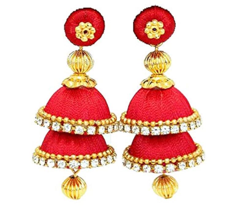 Enhance your style with these fashionable silk jhumkas earrings. Perfect for any occasion.