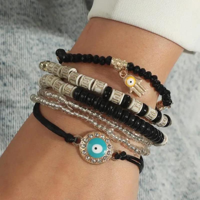Stay protected and trendy with this evil eye multilayer bangle bracelet. It features a stylish design that adds a touch of sophistication to any outfit.