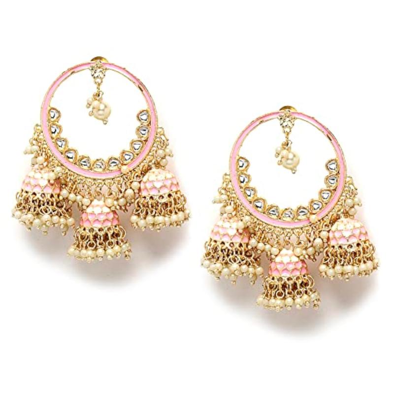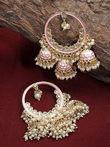 Elevate your ethnic look with these traditional kundan jhumka earrings featuring intricate craftsmanship and a pop of pink color.