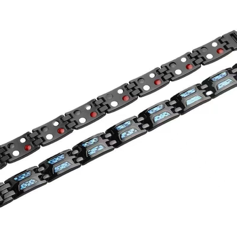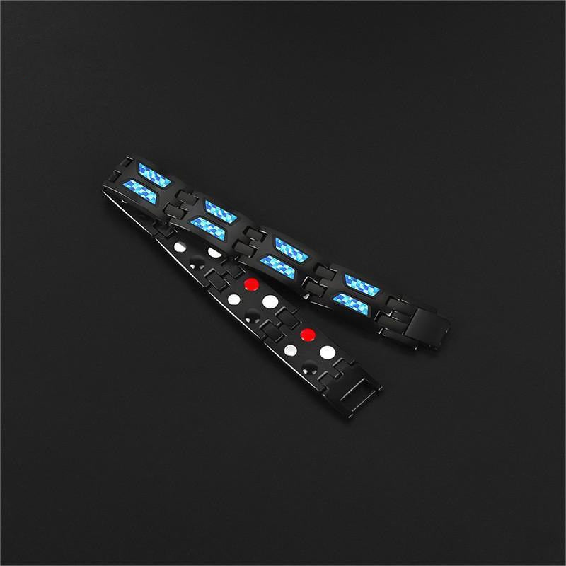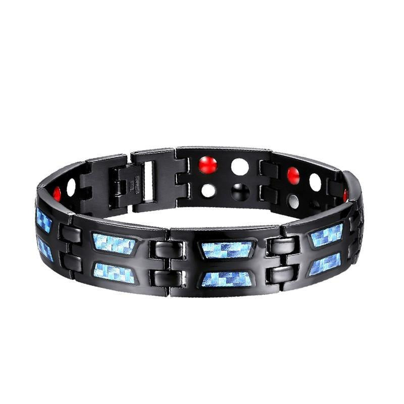 This double row magnet bracelet features a stylish design with a carbon fiber pattern. It is perfect for men looking for a fashionable accessory.