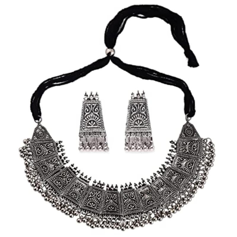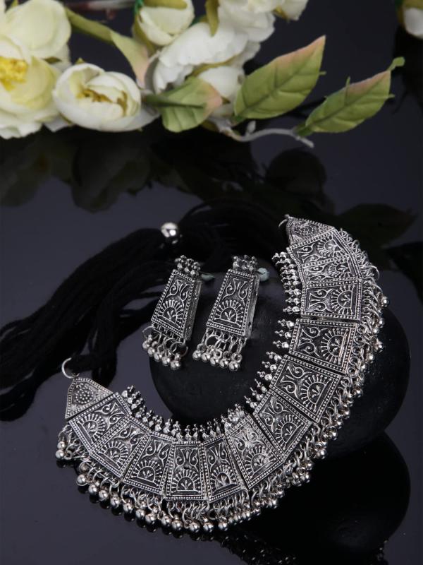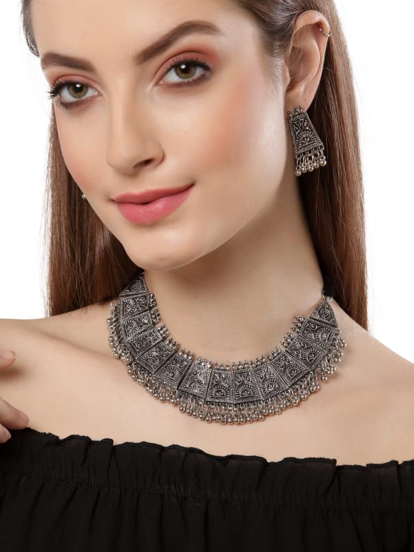 Elegant and traditional necklace set with an oxidized finish for a stylish look.