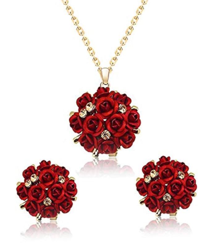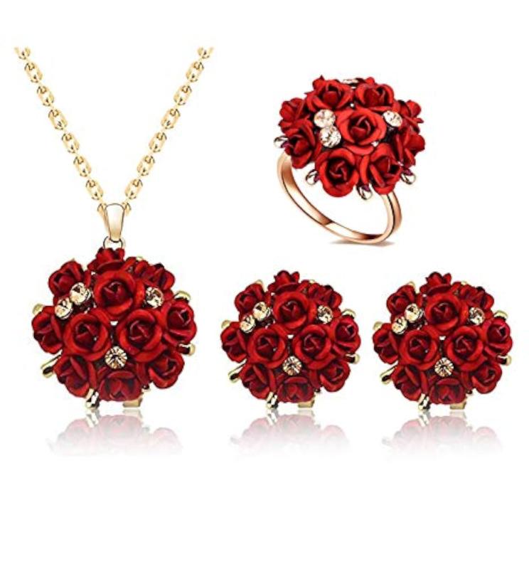 Enhance your look with this beautiful jewellery set featuring a floral necklace, earrings, and ring. Perfect for everyday wear or special occasions.