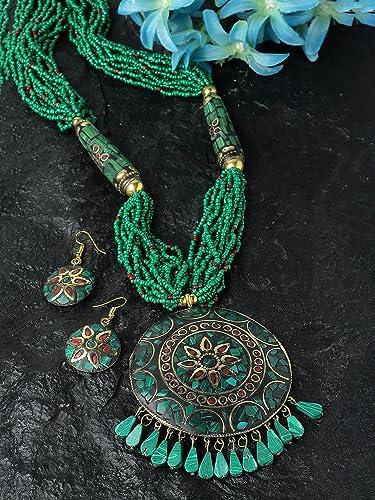 Elegant Tibetan pendant necklace set with oxidised finish for a traditional look.