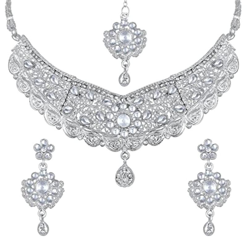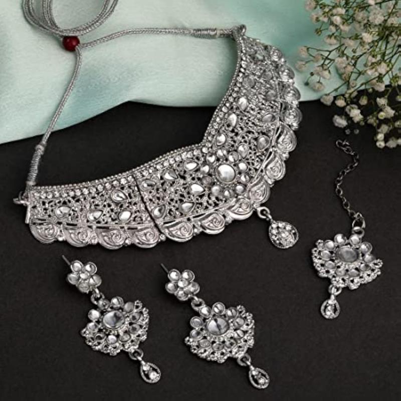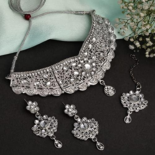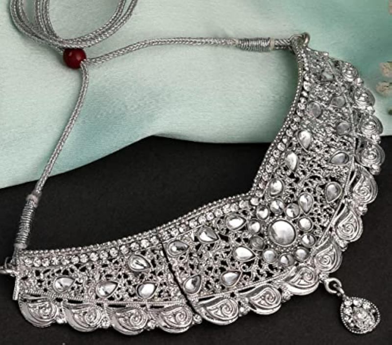 This exquisite choker necklace jewellery set features diamonds studded in a plated design, perfect for adding a touch of elegance to any outfit.