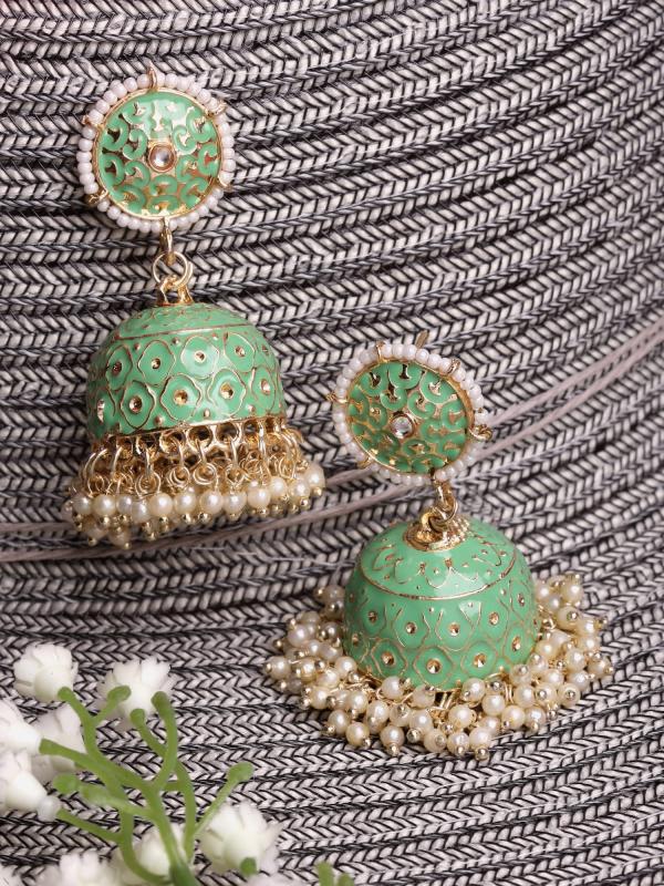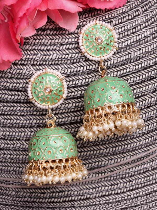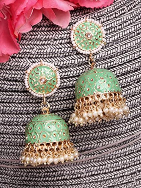 Elegant green traditional jhumka earrings for women with intricate design. Perfect for special occasions.