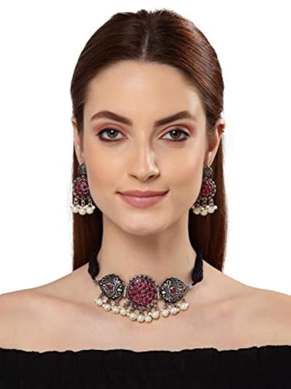 Enhance your traditional look with this elegant oxidised necklace set. Crafted with intricate design, it adds a touch of sophistication to your attire.