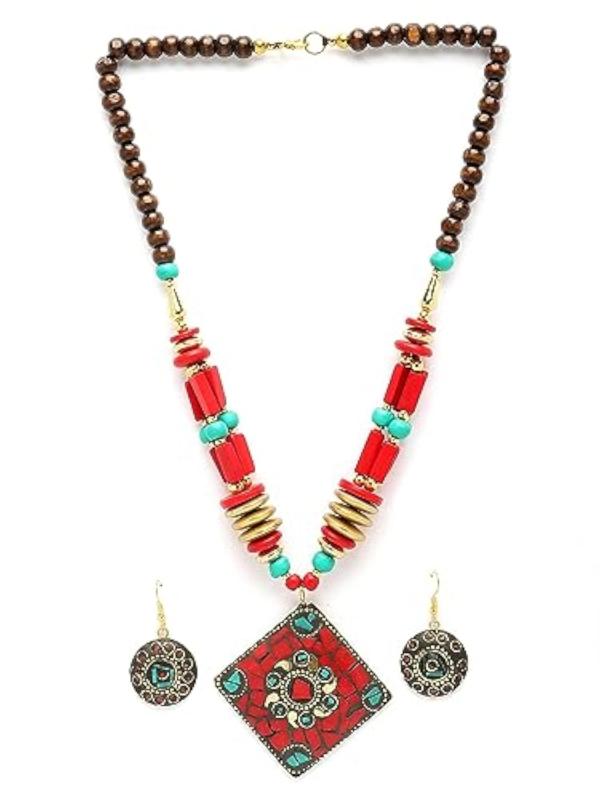 Explore the elegance of traditional Tibetan jewelry with this stylish pendant necklace set. Crafted with oxidised finish, this set is a perfect accessory for any occasion.