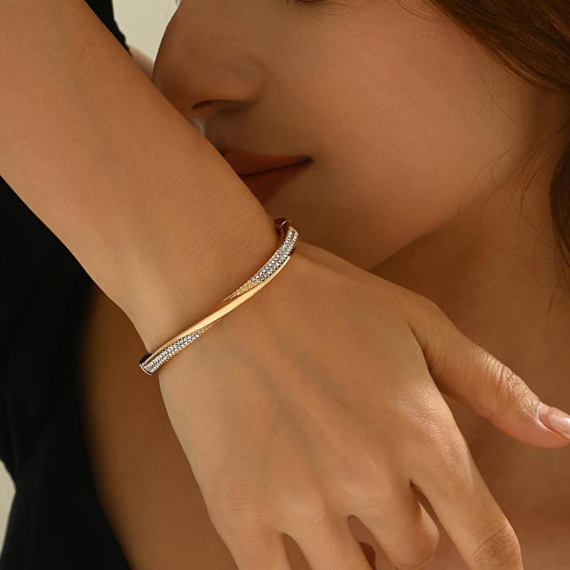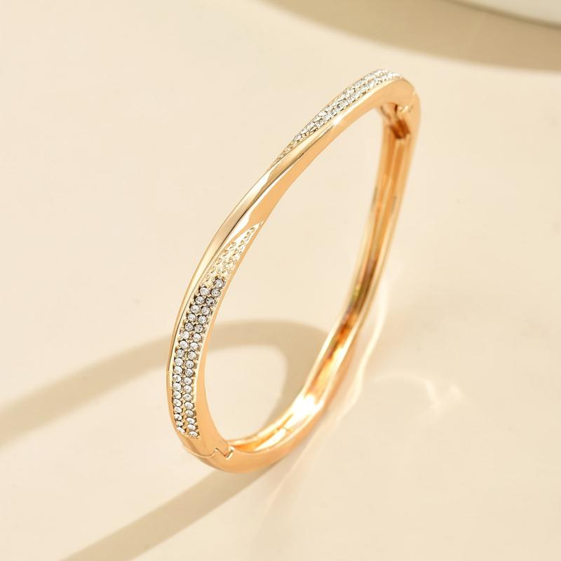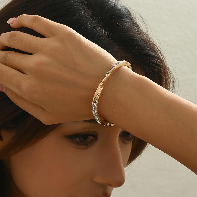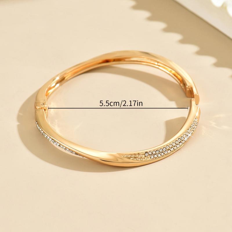This European and American inspired open bangle features an irregular twisted geometric shape with sparkling rhinestones for a chic and trendy look.