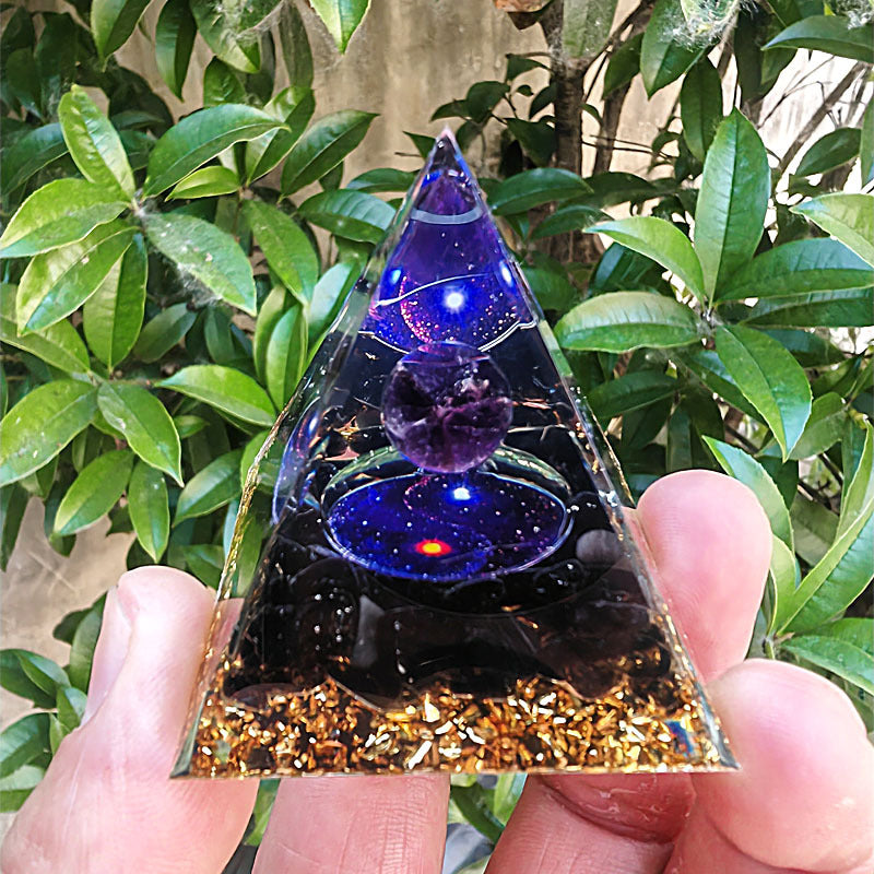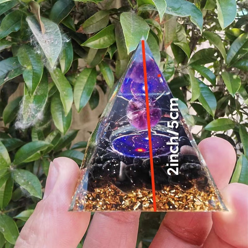 Enhance your success and well-being with this orgonite pyramid. It promotes anti-stress, calmness, growth, strength, and healing through crystal gemstones.
