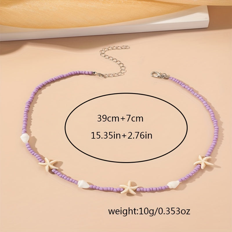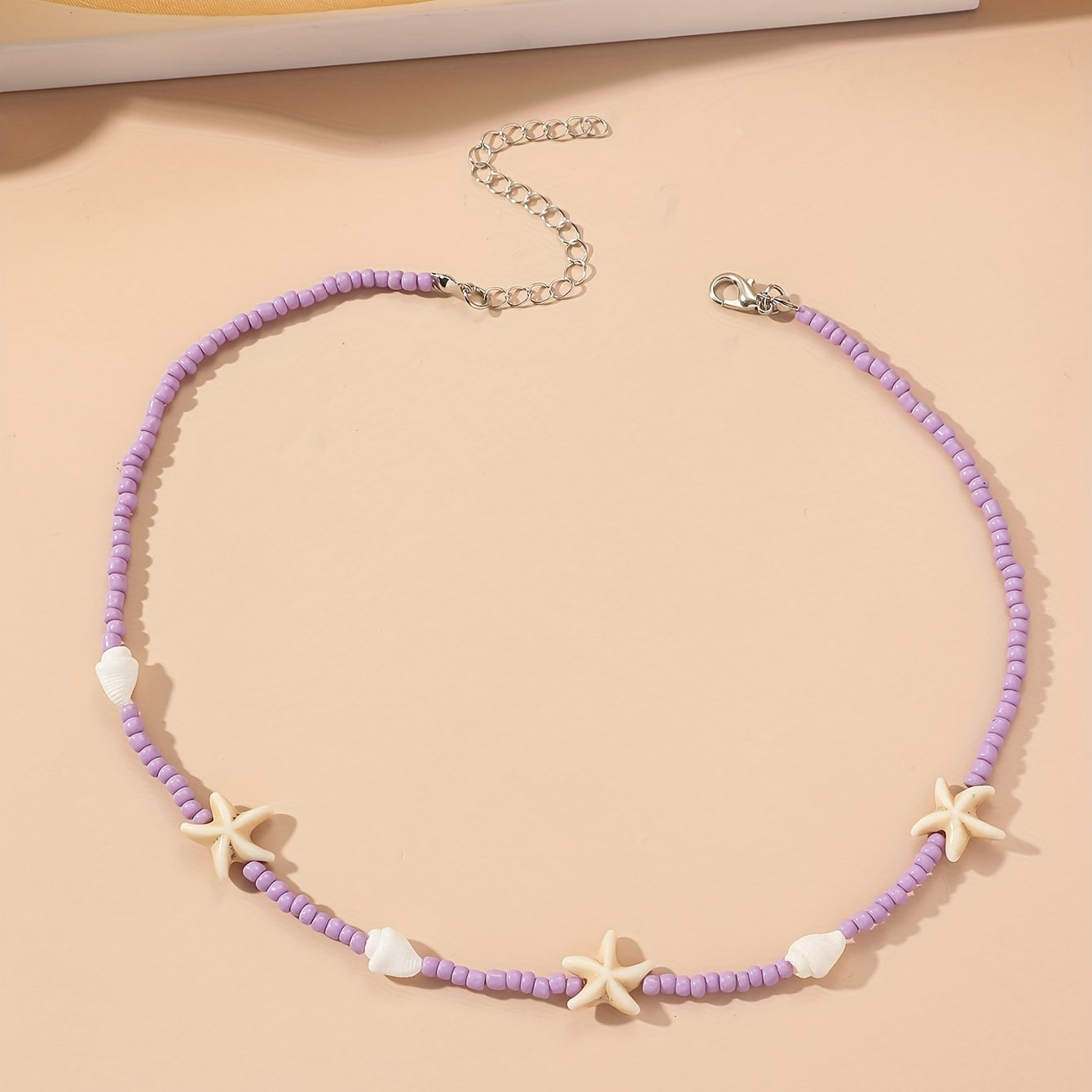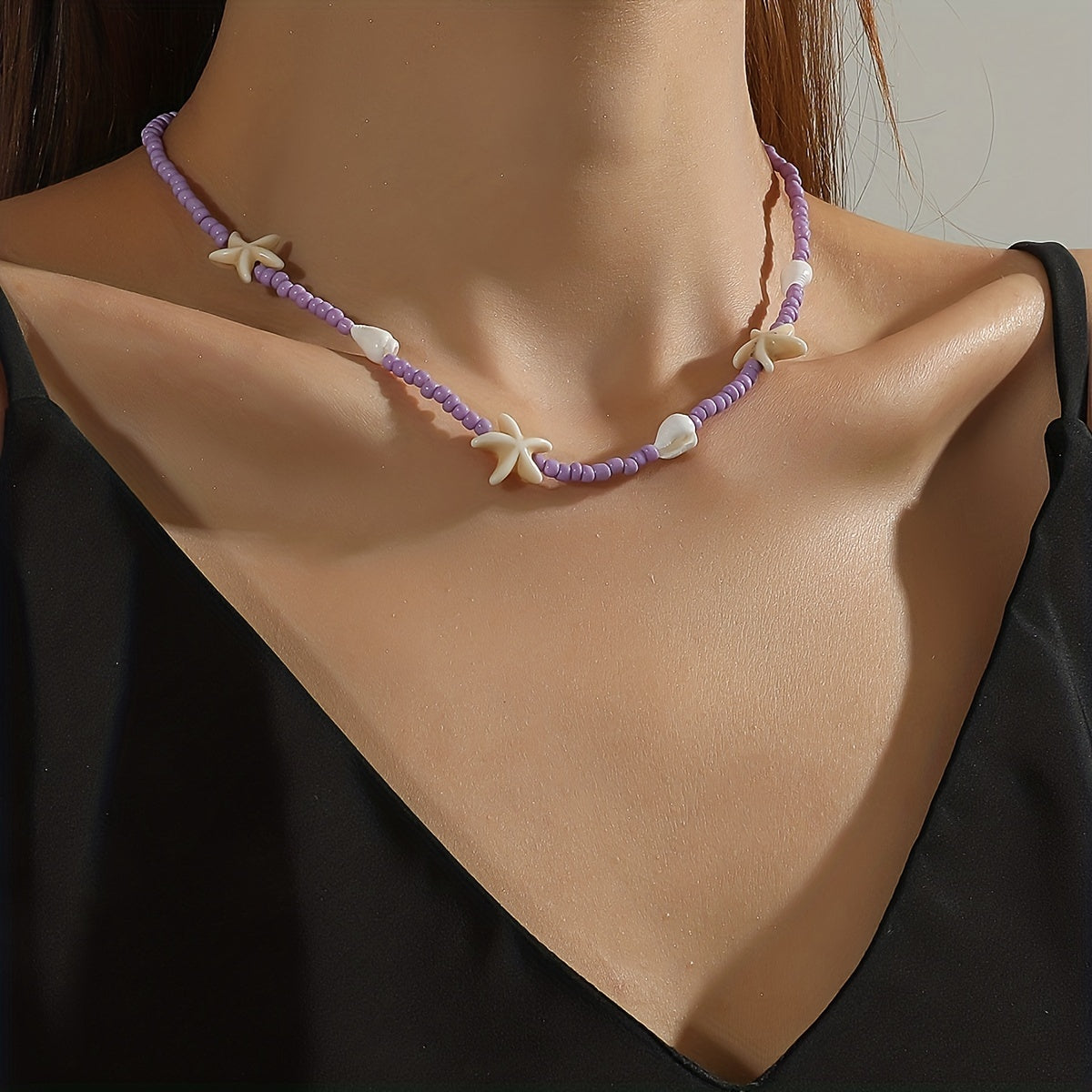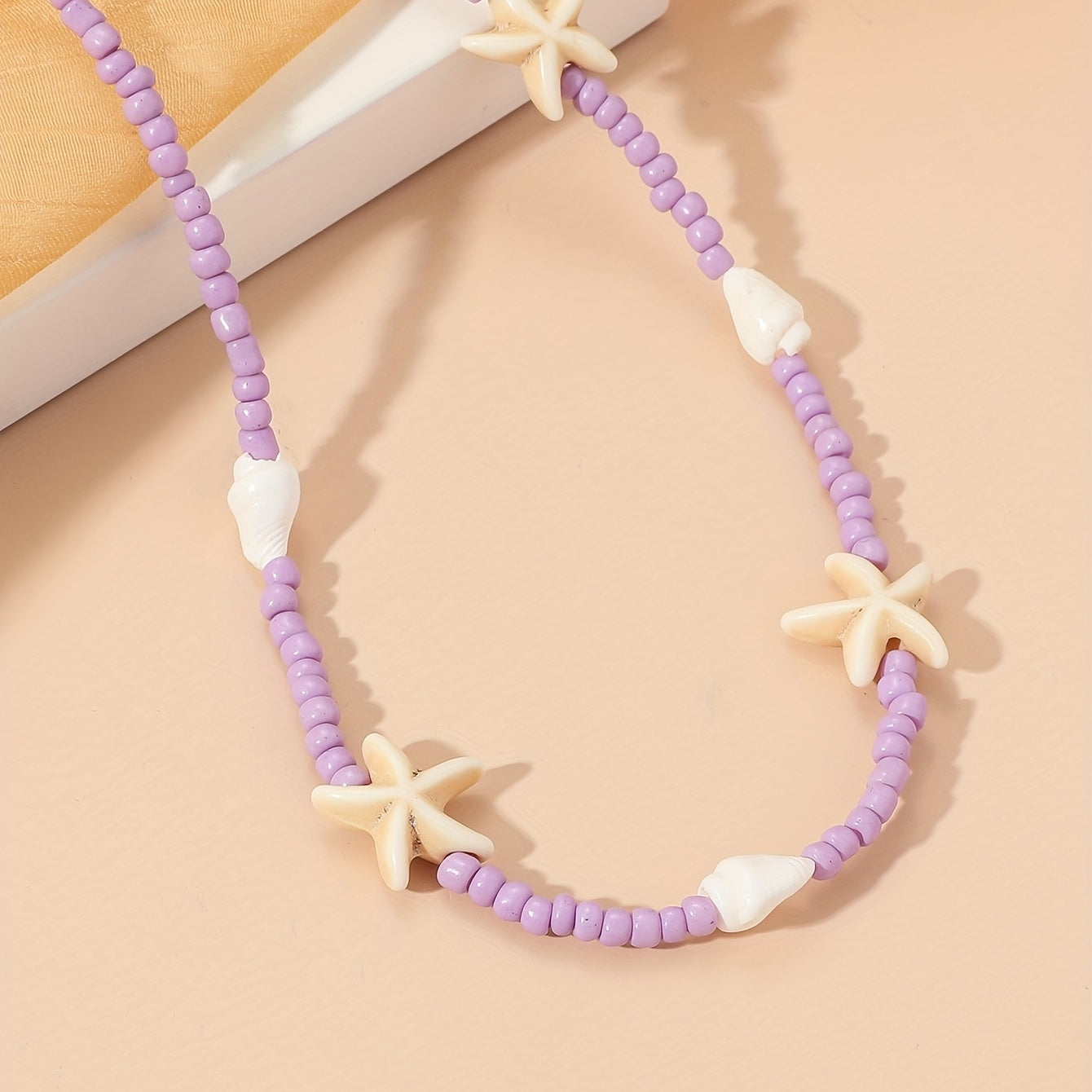 Add a touch of personality with this unique clavicle chain jewelry featuring purple beads, starfish, and conch. Perfect for summer beach outings.