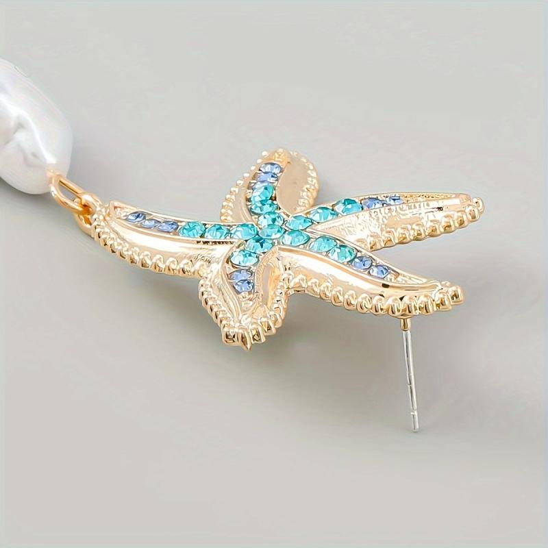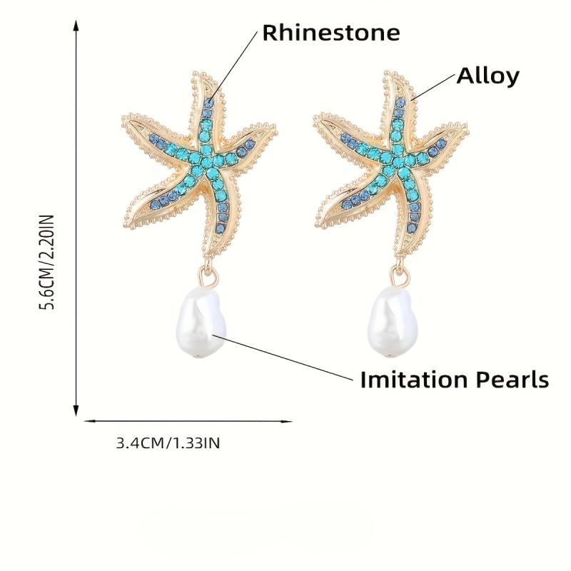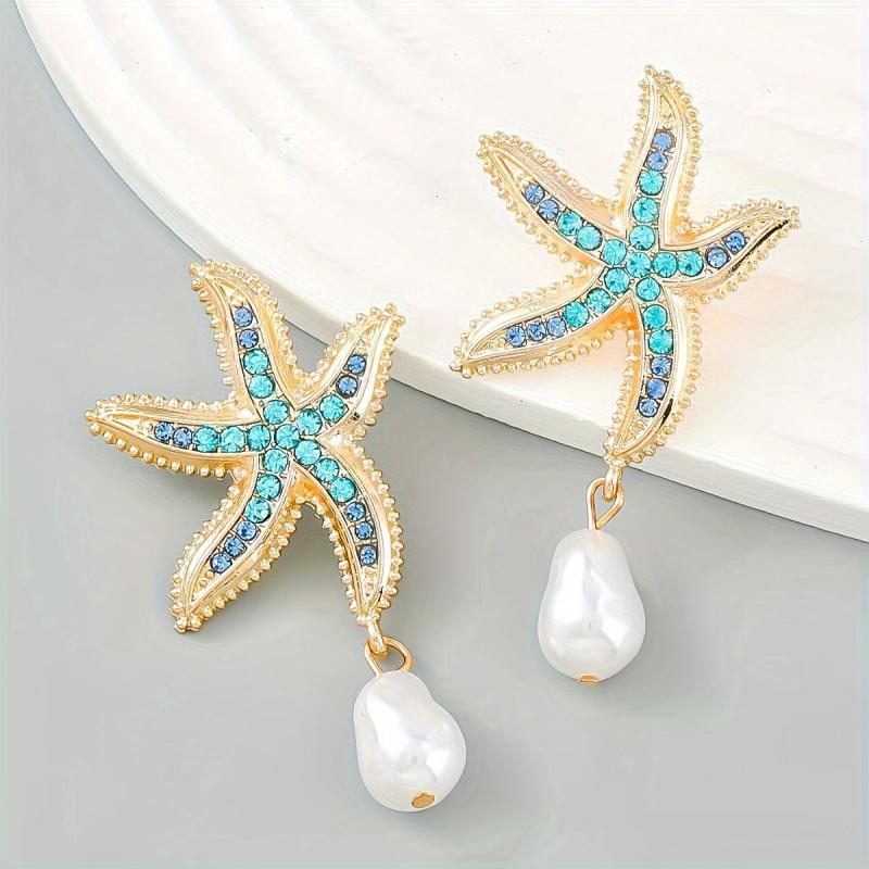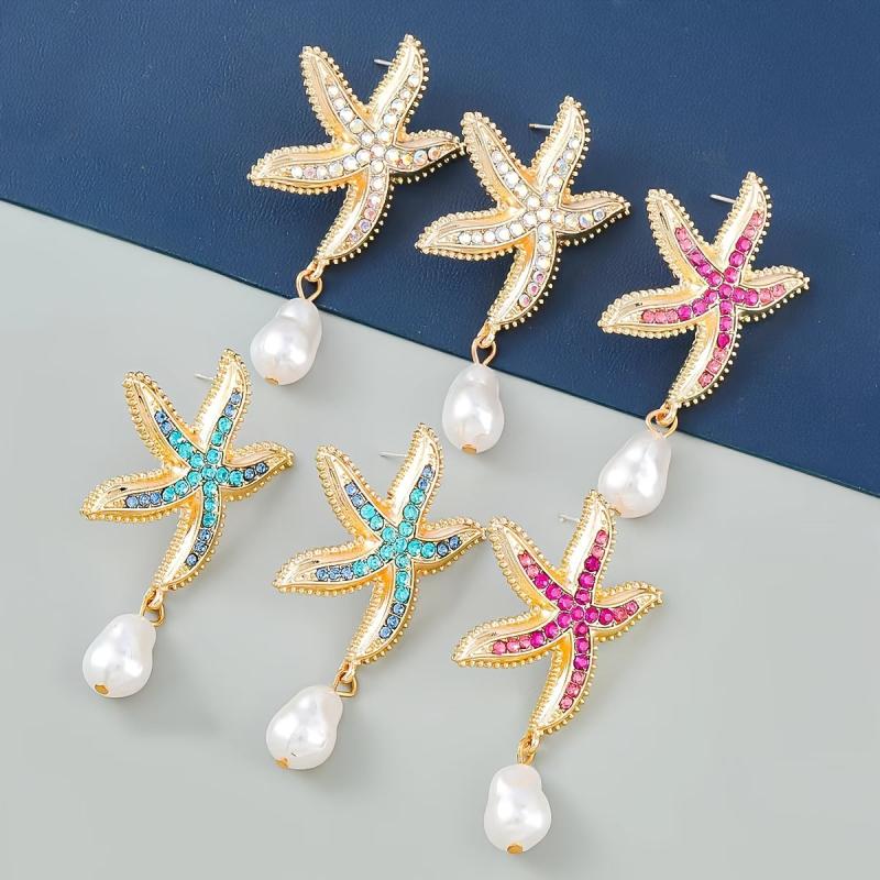 These ocean-themed earrings feature starfish and faux pearl drops, perfect for vacation in Europe or America.