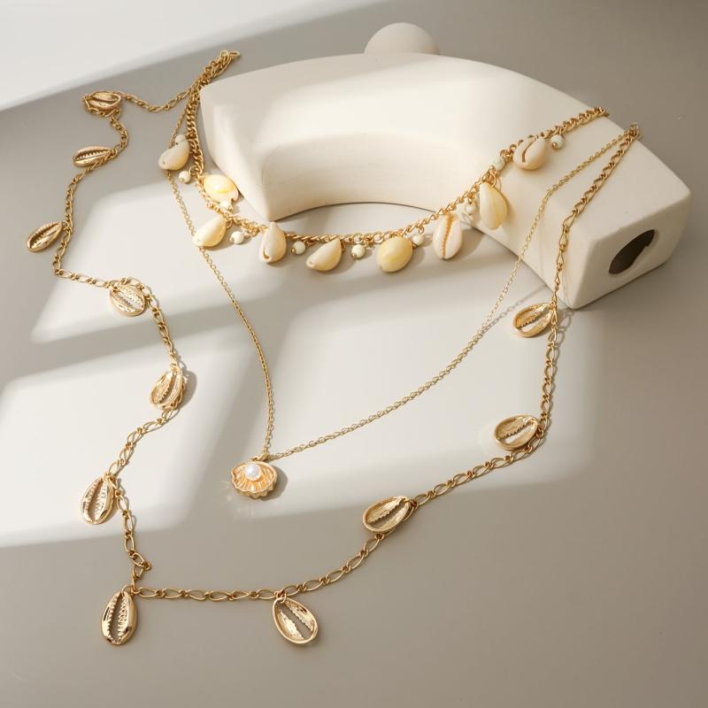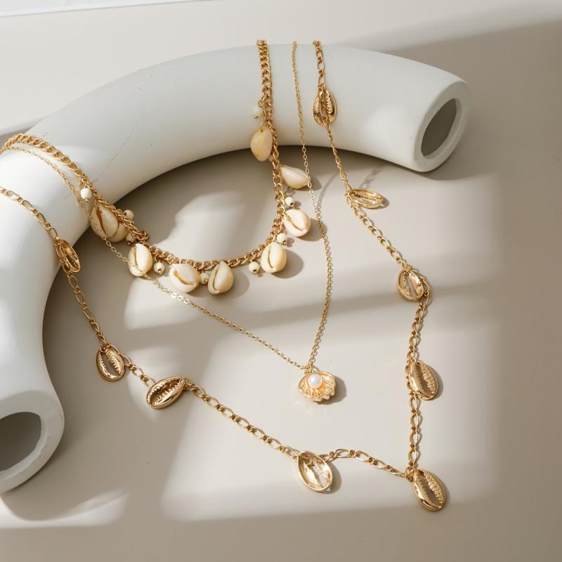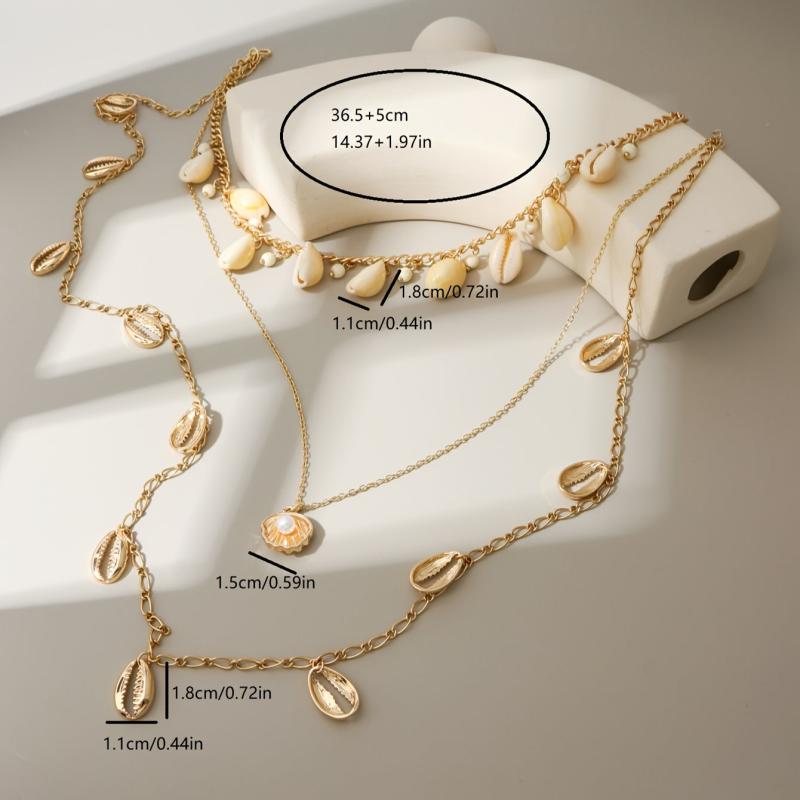 Add a touch of ocean style to your summer outfits with this layer chain necklace featuring multiple conch pendants and artificial pearl embellishments. Perfect for beach holidays!
