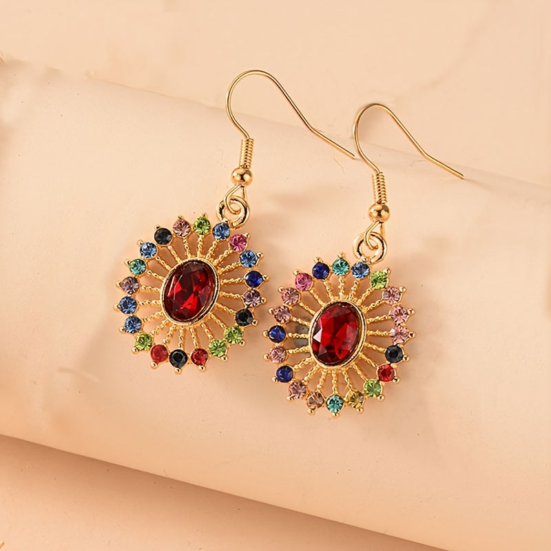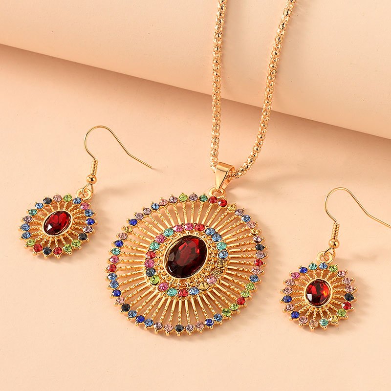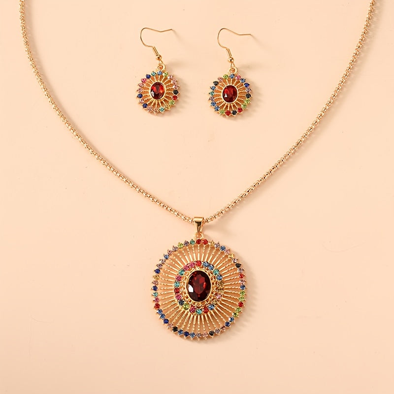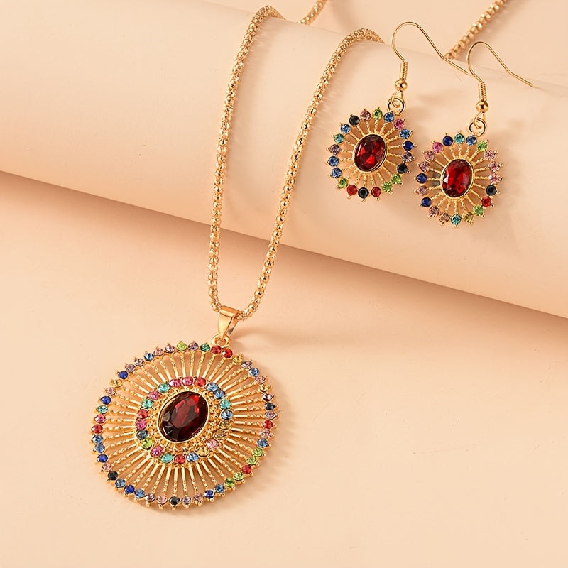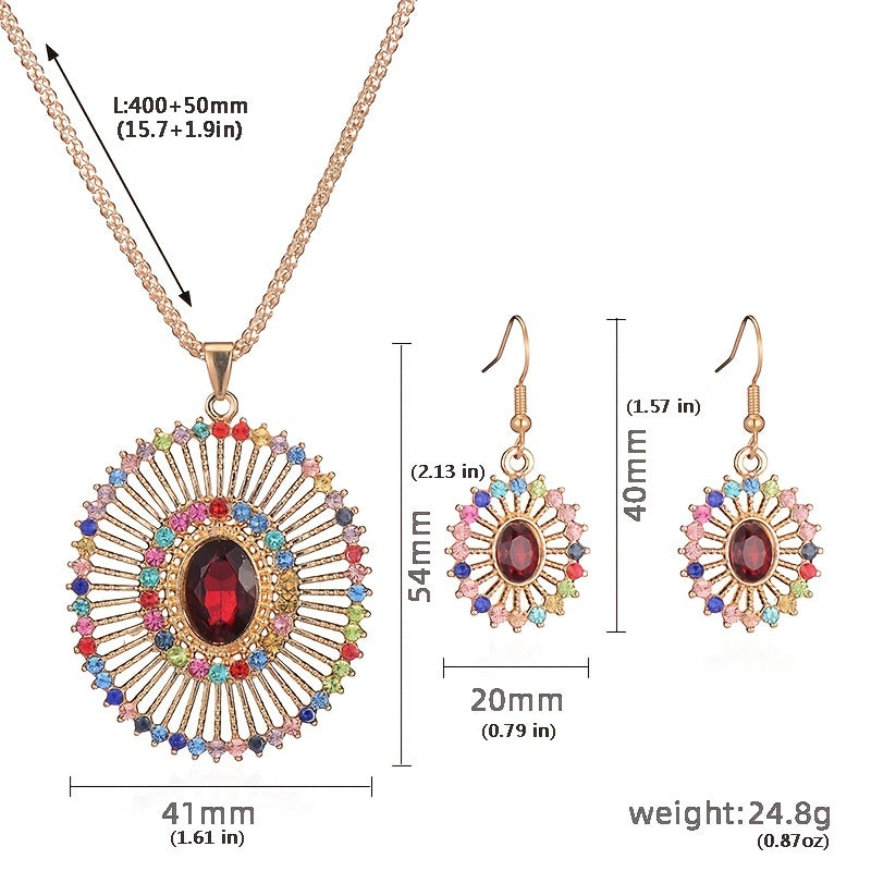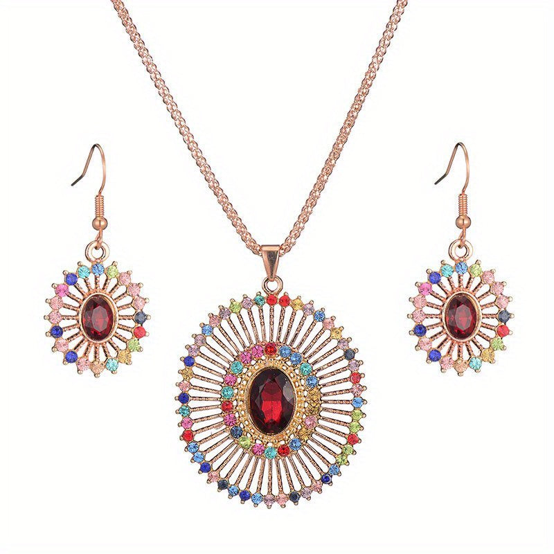 Elevate your holiday style with this stunning jewelry set featuring a sun ray shape pendant necklace and hook dangle earrings. The colorful synthetic gems add a pop of color to your outfit, making it the perfect gift for a loved one.